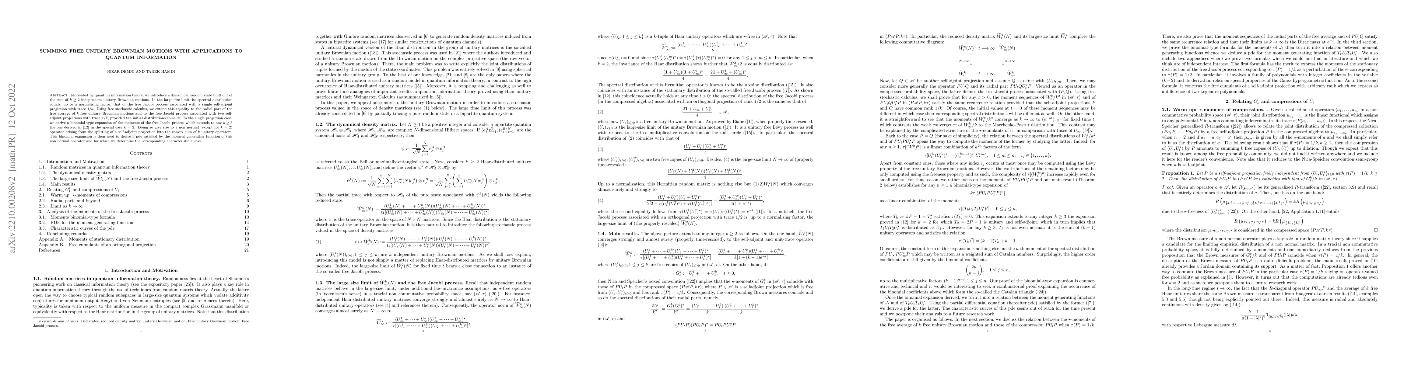 Motivated by quantum information theory, we introduce a dynamical random state built out of the sum of $k \geq 2$ independent unitary Brownian motions. In the large size limit, its spectral distribution equals, up to a normalising factor, that of the free Jacobi process associated with a single self-adjoint projection with trace $1/k$. Using free stochastic calculus, we extend this equality to the radial part of the free average of $k$ free unitary Brownian motions and to the free Jacobi process associated with two self-adjoint projections with trace $1/k$, provided the initial distributions coincide. In the single projection case, we derive a binomial-type expansion of the moments of the free Jacobi process which extends to any $k \geq 3$ the one derived in \cite {DHH} in the special case $k=2$. Doing so give rise to a non normal (except for $k=2$) operator arising from the splitting of a self-adjoint projection into the convex sum of $k$ unitary operators. This binomial expansion is then used to derive a pde for the moment generating function of this non normal operator and for which we determine the corresponding characteristic curves.