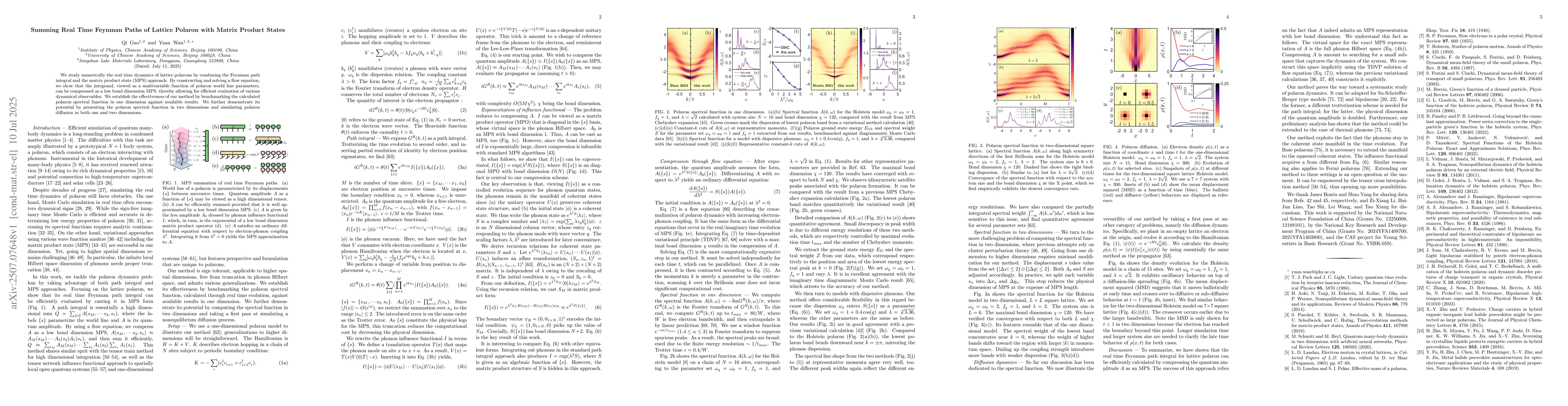 We study numerically the real time dynamics of lattice polarons by combining the Feynman path integral and the matrix product state (MPS) approach. By constructing and solving a flow equation, we show that the integrand, viewed as a multivariable function of polaron world line parameters, can be compressed as a low bond dimension MPS, thereby allowing for efficient evaluation of various dynamical observables. We establish the effectiveness of our method by benchmarking the calculated polaron spectral function in one dimension against available results. We further demonstrate its potential by presenting the polaron spectral function in two dimensions and simulating polaron diffusion in both one and two dimensions.