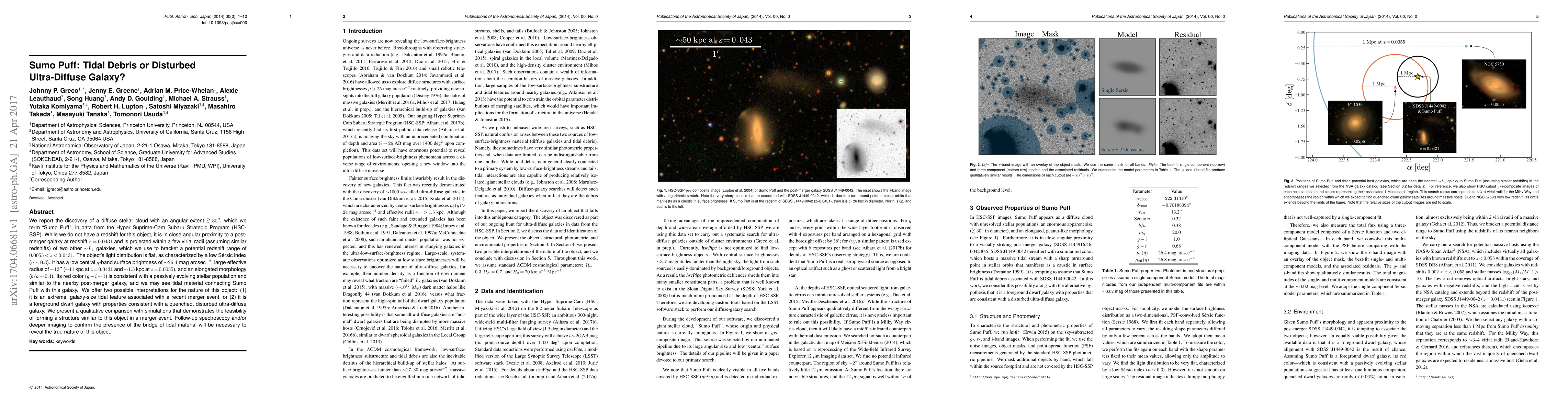 The paper reports the discovery of "Sumo Puff," a large, diffuse stellar cloud possibly linked to a nearby post-merger galaxy, with properties suggesting it could either be an extreme tidal feature or a disturbed ultra-diffuse galaxy. Further observations are needed to determine its true nature.