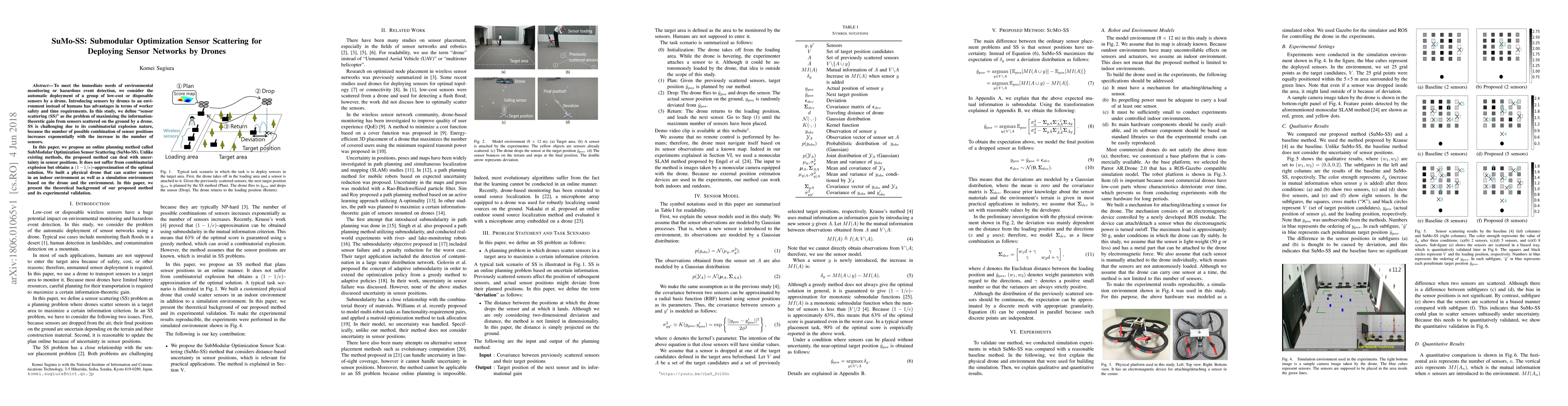To meet the immediate needs of environmental monitoring or hazardous event detection, we consider the automatic deployment of a group of low-cost or disposable sensors by a drone. Introducing sensors by drones to an environment instead of humans has advantages in terms of worker safety and time requirements. In this study, we define "sensor scattering (SS)" as the problem of maximizing the information-theoretic gain from sensors scattered on the ground by a drone. SS is challenging due to its combinatorial explosion nature, because the number of possible combination of sensor positions increases exponentially with the increase in the number of sensors. In this paper, we propose an online planning method called SubModular Optimization Sensor Scattering (SuMo-SS). Unlike existing methods, the proposed method can deal with uncertainty in sensor positions. It does not suffer from combinatorial explosion but obtains a (1-1/e)-approximation of the optimal solution. We built a physical drone that can scatter sensors in an indoor environment as well as a simulation environment based on the drone and the environment. In this paper, we present the theoretical background of our proposed method and its experimental validation.