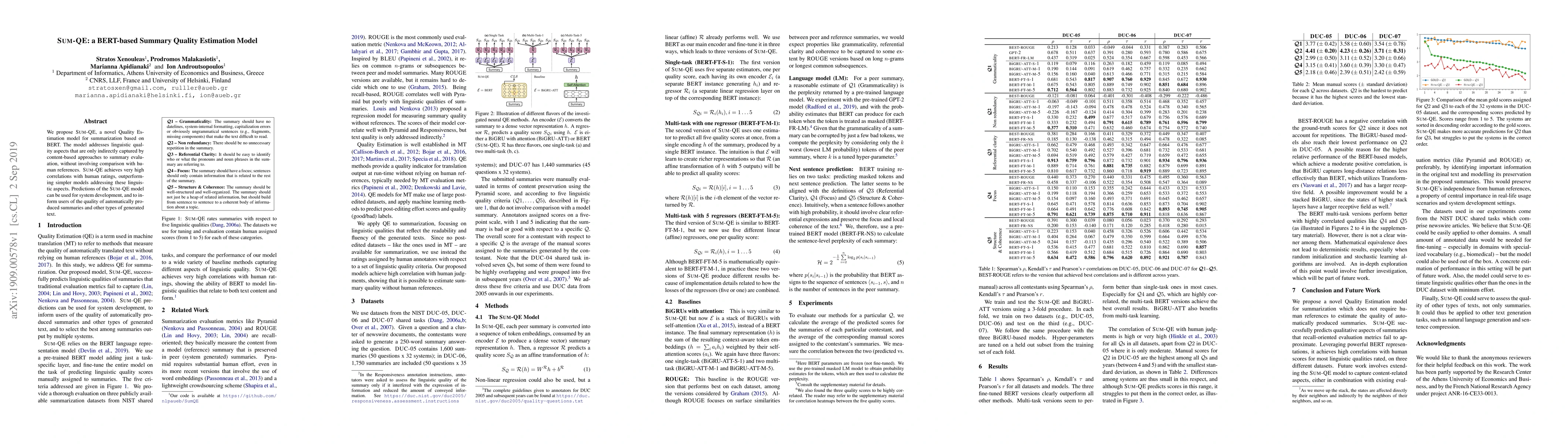 We propose SumQE, a novel Quality Estimation model for summarization based on BERT. The model addresses linguistic quality aspects that are only indirectly captured by content-based approaches to summary evaluation, without involving comparison with human references. SumQE achieves very high correlations with human ratings, outperforming simpler models addressing these linguistic aspects. Predictions of the SumQE model can be used for system development, and to inform users of the quality of automatically produced summaries and other types of generated text.