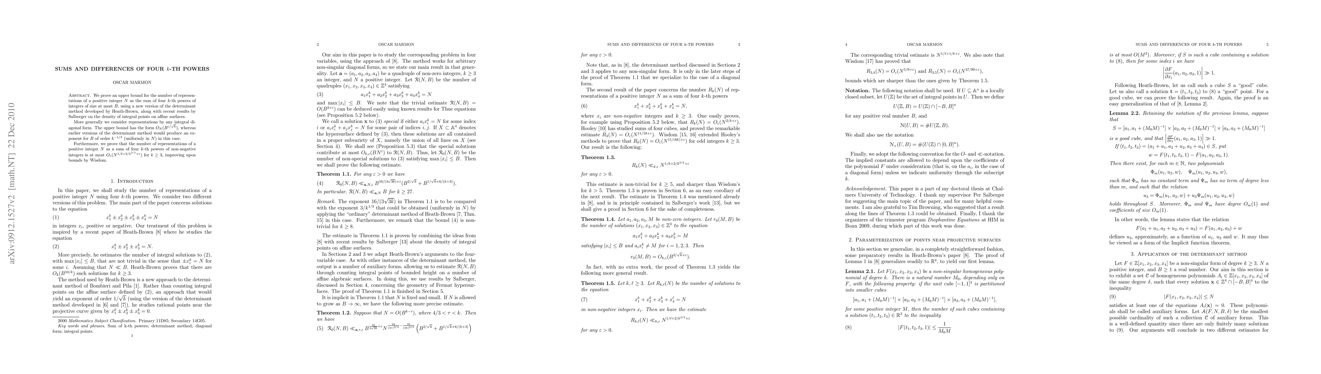 We prove an upper bound for the number of representations of a positive integer $N$ as the sum of four $k$-th powers of integers of size at most $B$, using a new version of the Determinant method developed by Heath-Brown, along with recent results by Salberger on the density of integral points on affine surfaces. More generally we consider representations by any integral diagonal form. The upper bound has the form $O_{N}(B^{c/\sqrt{k}})$, whereas earlier versions of the Determinant method would produce an exponent for $B$ of order $k^{-1/3}$ in this case. Furthermore, we prove that the number of representations of a positive integer $N$ as a sum of four $k$-th powers of non-negative integers is at most $O_{\epsilon}(N^{1/k+2/k^{3/2}+\epsilon})$ for $k \geq 3$, improving upon bounds by Wisdom.