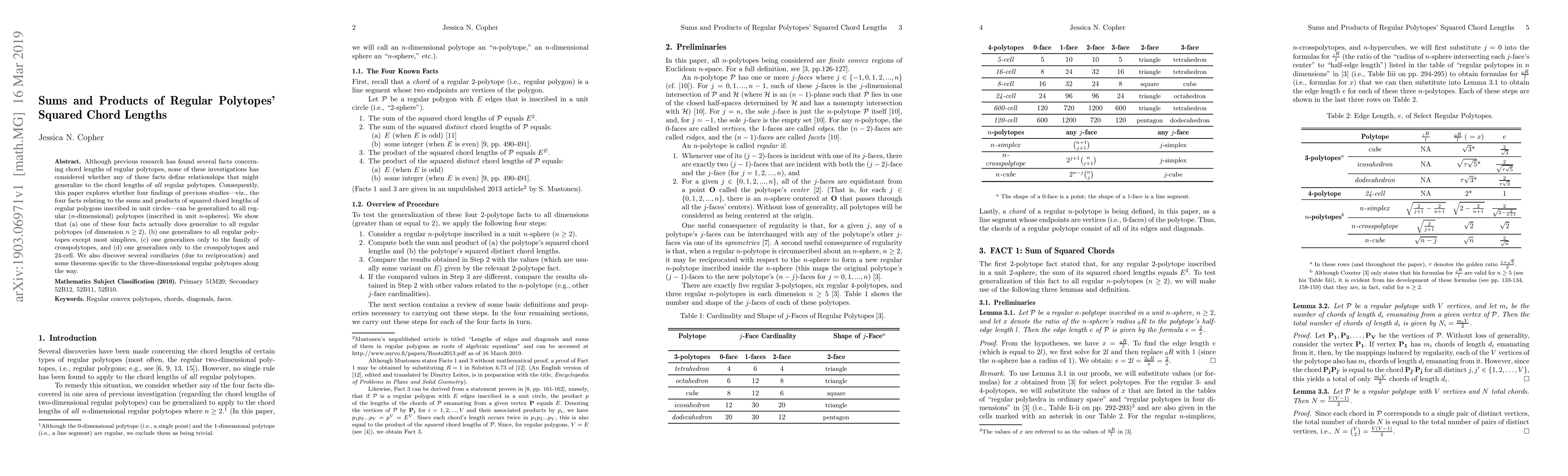 Although previous research has found several facts concerning chord lengths of regular polytopes, none of these investigations has considered whether any of these facts define relationships that might generalize to the chord lengths of all regular polytopes. Consequently, this paper explores whether four findings of previous studies-- viz., the four facts relating to the sums and products of squared chord lengths of regular polygons inscribed in unit circles-- can be generalized to all regular ($n$-dimensional) polytopes (inscribed in unit $n$-spheres). We show that (a) one of these four facts actually does generalize to all regular polytopes (of dimension $n \geq 2$), (b) one generalizes to all regular polytopes except most simplices, (c) one generalizes only to the family of crosspolytopes, and (d) one generalizes only to the crosspolytopes and 24-cell. We also discover several corollaries (due to reciprocation) and some theorems specific to the three-dimensional regular polytopes along the way.