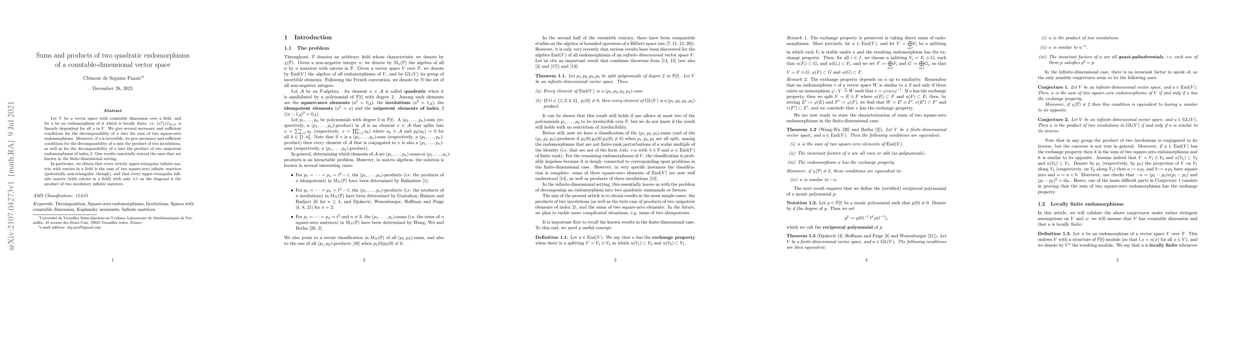 This paper explores the decomposability of locally finite quadratic endomorphisms in countable-dimensional vector spaces into sums and products of simpler endomorphisms. It provides conditions for decomposing an invertible endomorphism into products of involutions or unipotent endomorphisms, extending known finite-dimensional results.