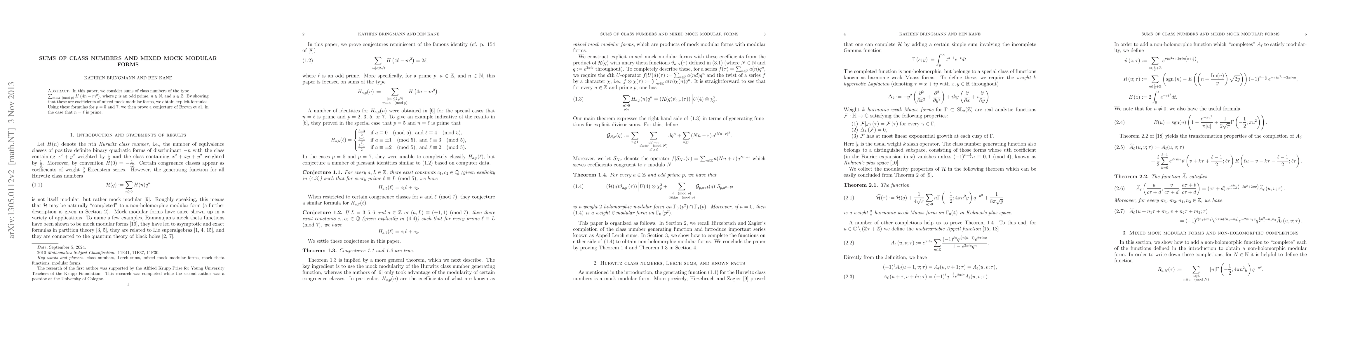 This paper investigates sums of class numbers involving mixed mock modular forms, specifically $\sum_{m\equiv a\pmod{p}} H(4n-m^2)$, and demonstrates they are coefficients of these forms. It provides explicit formulas and uses them to prove a conjecture for $p=5$ and $7$ when $n$ is prime.