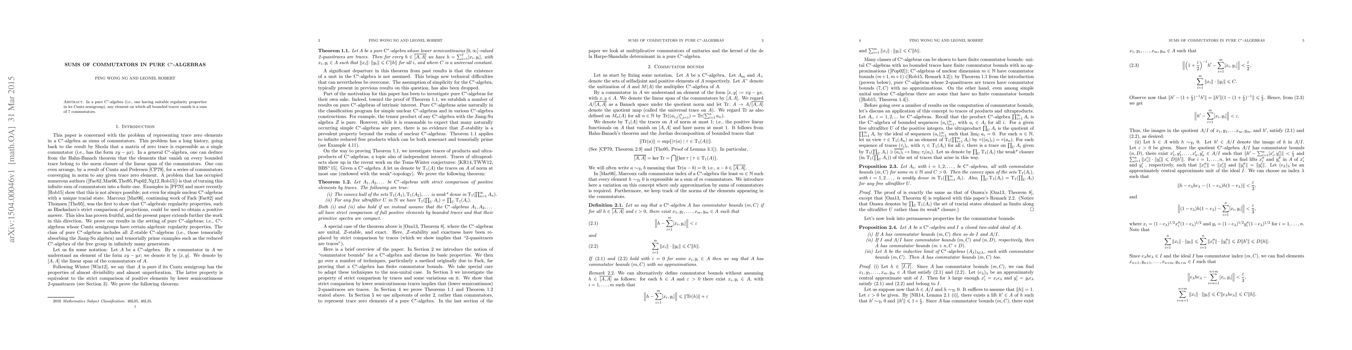 In a pure C*-algebra (i.e., one having suitable regularity properties in its Cuntz semigroup), any element on which all bounded traces vanish is a sum of 7 commutators.