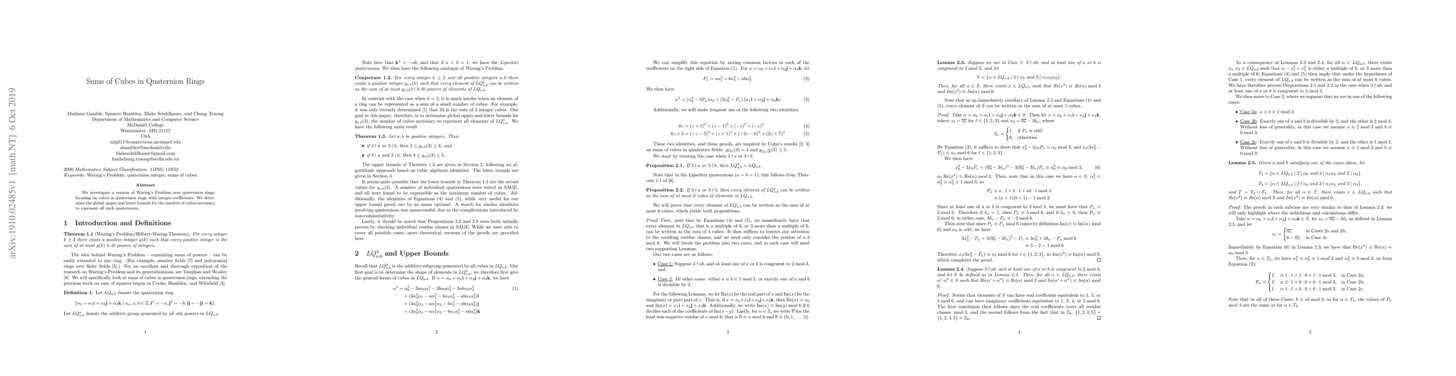 This paper explores Waring's Problem in the context of quaternion rings with integer coefficients, determining the minimum and maximum number of cubes required to represent all such quaternions. The study provides global bounds for the representation of quaternions as sums of cubes.