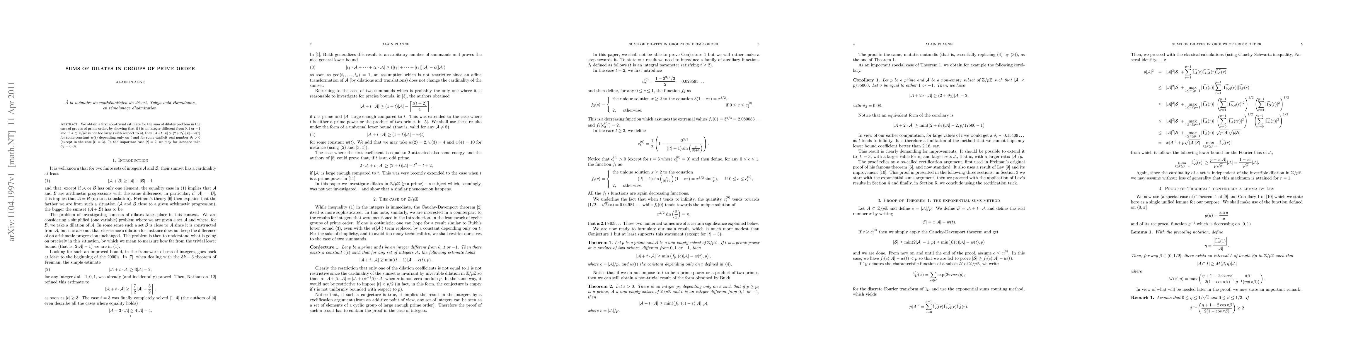 This paper provides the first non-trivial estimate for the sum of dilates problem in groups of prime order, showing that for a non-trivial integer $t$ and a sufficiently small subset $\A \subset \Zp$, the size of $\A+t\cdot \A$ exceeds $(2+\vartheta_t)|\A|$ for a positive $\vartheta_t$ (except when $|t|=3$), with a constant $w(t)$ depending only on $t$. For $|t|=2$, $\vartheta_2$ is explicitly given as 0.08.