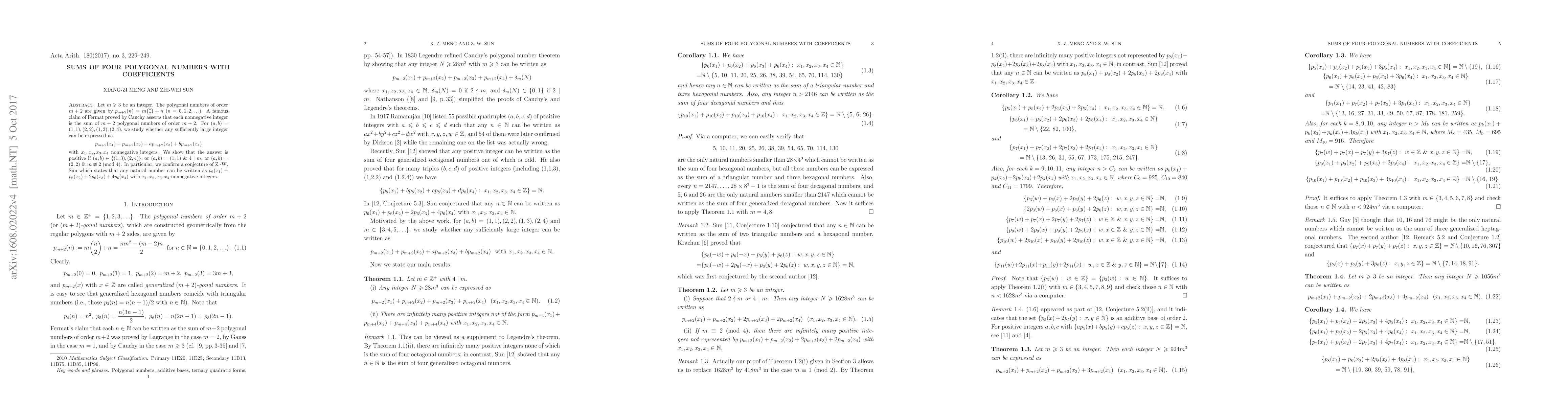 This paper explores the representation of sufficiently large integers as sums of four polygonal numbers with specific coefficients, confirming that such representations are possible under certain conditions for the coefficients and the order of the polygonal numbers. It verifies a conjecture regarding the representation of natural numbers using hexagonal numbers with coefficients.