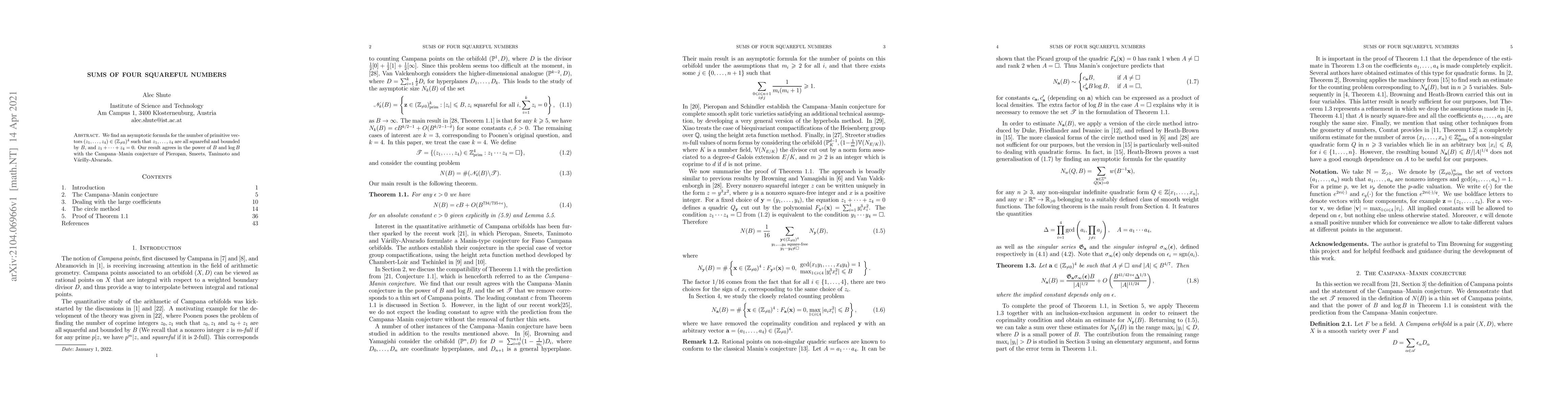 We find an asymptotic formula for the number of primitive vectors $(z_1,\ldots,z_4)\in (\mathbb{Z}_{\neq 0})^4$ such that $z_1,\ldots, z_4$ are all squareful and bounded by $B$, and $z_1+\cdots + z_4 = 0$. Our result agrees in the power of $B$ and $\log B$ with the Campana-Manin conjecture of Pieropan, Smeets, Tanimoto and V\'{a}rilly-Alvarado.