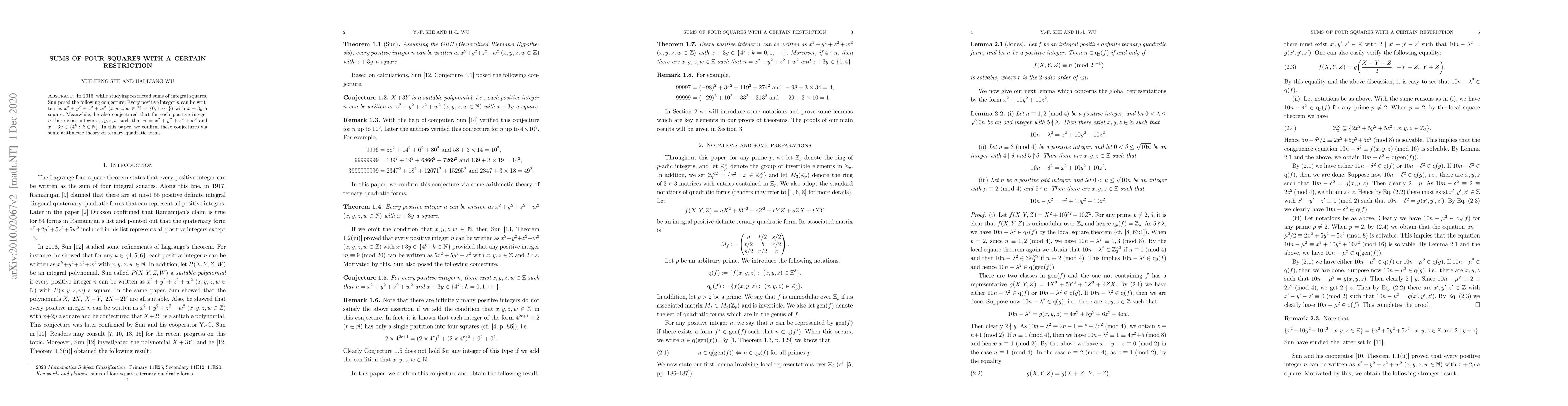 This paper confirms Sun's conjectures that every positive integer can be expressed as the sum of four squares where one of the terms is constrained by $x+3y$ being a square, and specifically that $x+3y$ belongs to the set $\{4^k: k\in\mathbb{N}\}$. The confirmation is achieved through the application of arithmetic theory of ternary quadratic forms.