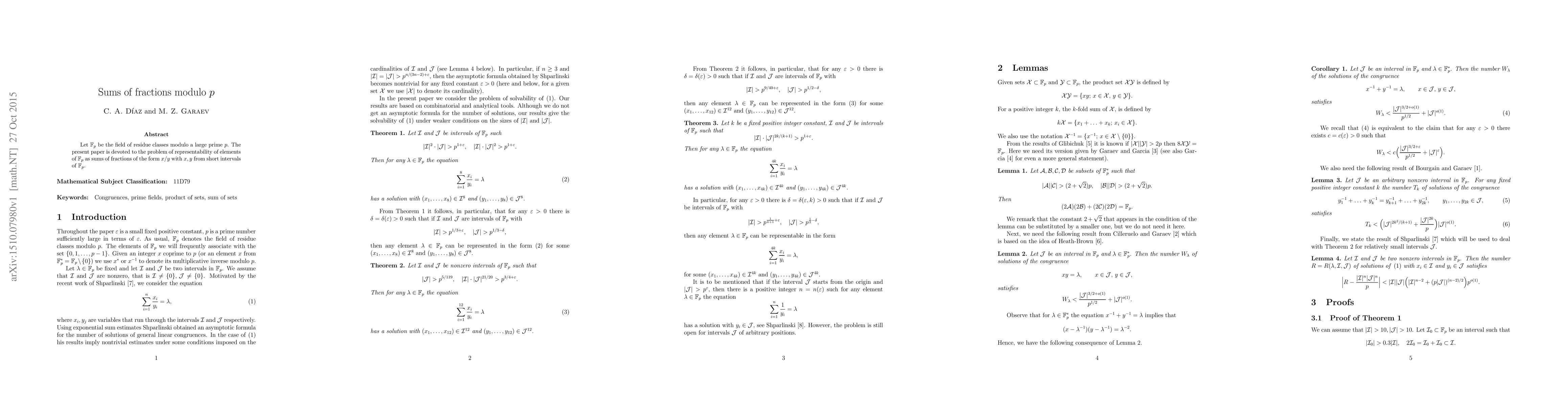 Let $\F_p$ be the field of residue classes modulo a large prime $p$. The present paper is devoted to the problem of representability of elements of $\F_p$ as sums of fractions of the form $x/y$ with $x,y$ from short intervals of $\F_p$.