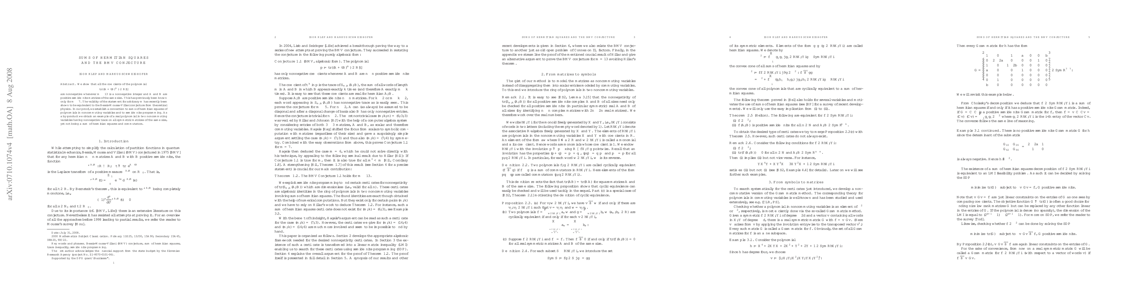 Recently Lieb and Seiringer showed that the Bessis-Moussa-Villani conjecture from quantum physics can be restated in the following purely algebraic way: The sum of all words in two positive semidefinite matrices where the number of each of the two letters is fixed is always a matrix with nonnegative trace. We show that this statement holds if the words are of length at most 13. This has previously been known only up to length 7. In our proof, we establish a connection to sums of hermitian squares of polynomials in noncommuting variables and to semidefinite programming. As a by-product we obtain an example of a real polynomial in two noncommuting variables having nonnegative trace on all symmetric matrices of the same size, yet not being a sum of hermitian squares and commutators.