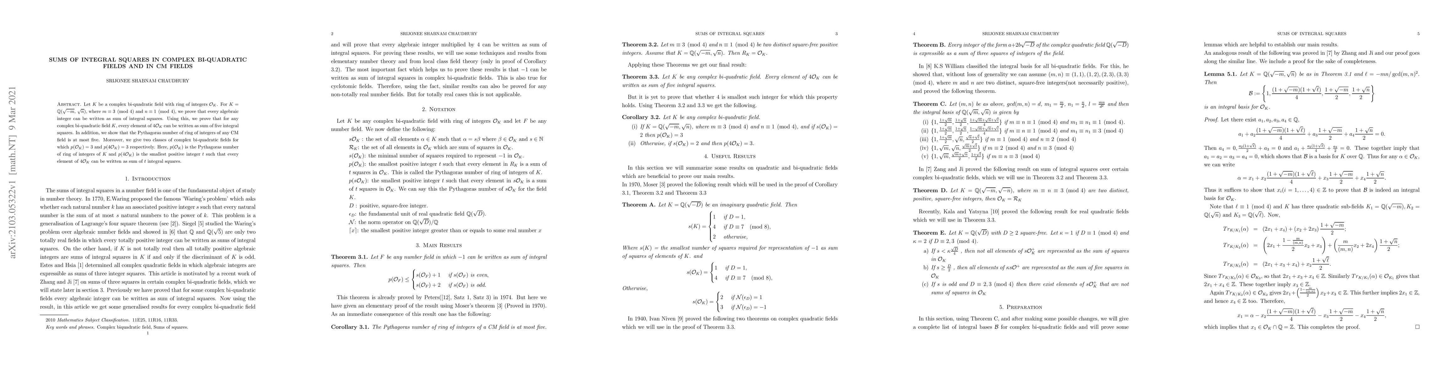 This paper proves that every algebraic integer in complex bi-quadratic fields can be expressed as a sum of integral squares and that every element in $4\mathcal{O}_K$ can be written as a sum of five integral squares. It also establishes the Pythagoras number for CM fields is at most five.