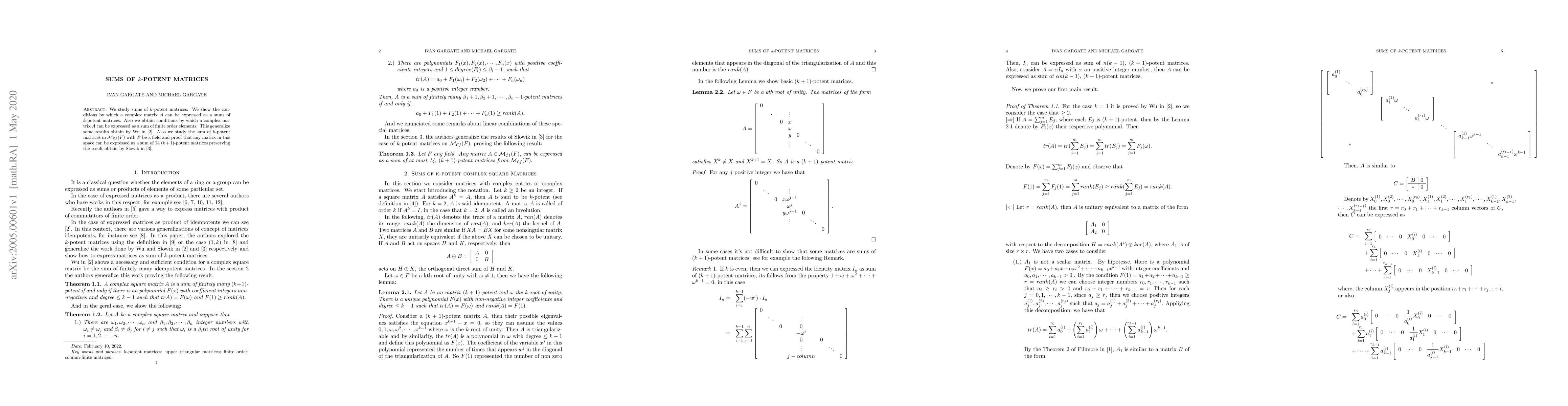**Summary:** This paper explores conditions for expressing complex matrices as sums of $k$-potent matrices and finite order elements, generalizing prior results by Wu. It also extends findings by Slowik, proving that any matrix in $\mathcal{M}_{\mathcal{C}f}(F)$ can be represented as a sum of $(k+1)$-potent matrices, specifically $14$ such matrices.