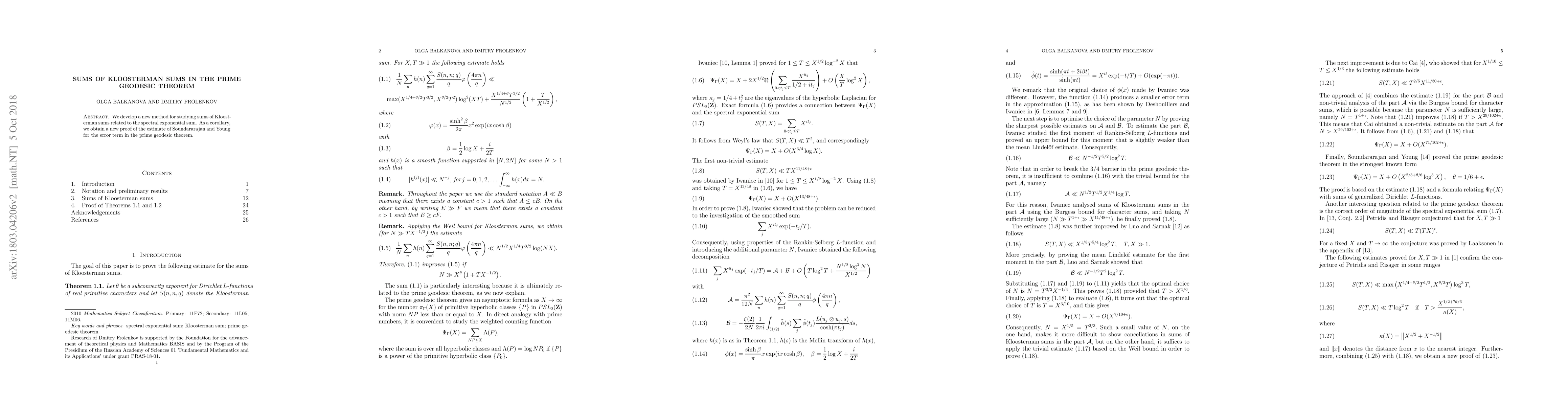 This paper introduces a novel approach to analyze sums of Kloosterman sums connected to spectral exponential sums, leading to a new proof of Soundararajan and Young's estimate for the error term in the prime geodesic theorem.