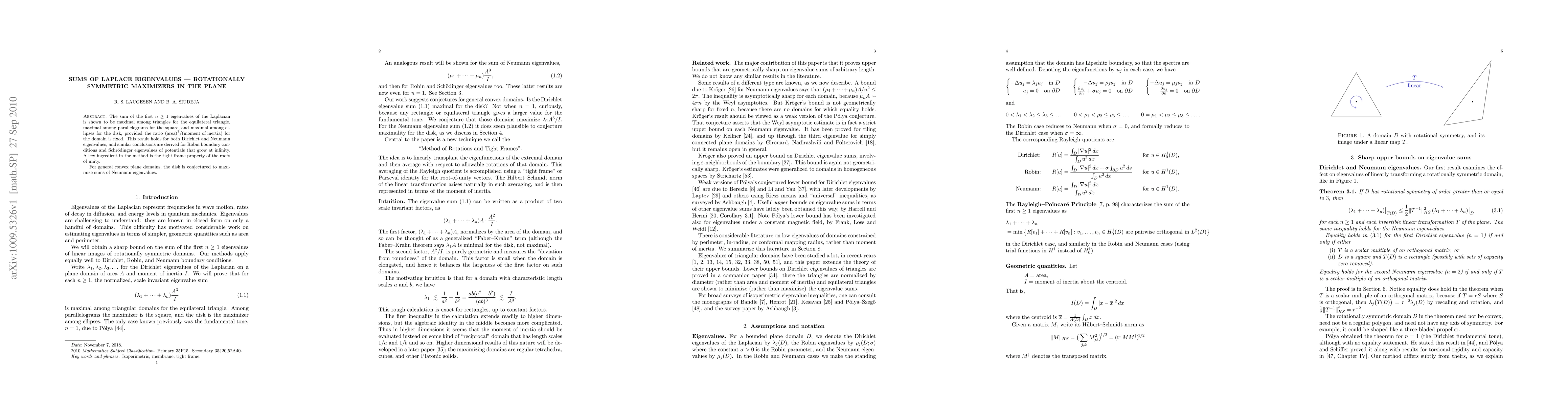 The sum of Laplace eigenvalues is maximized for specific shapes (equilateral triangle, square, ellipse) under certain conditions, with the disk being a general conjectured maximum for convex plane domains.