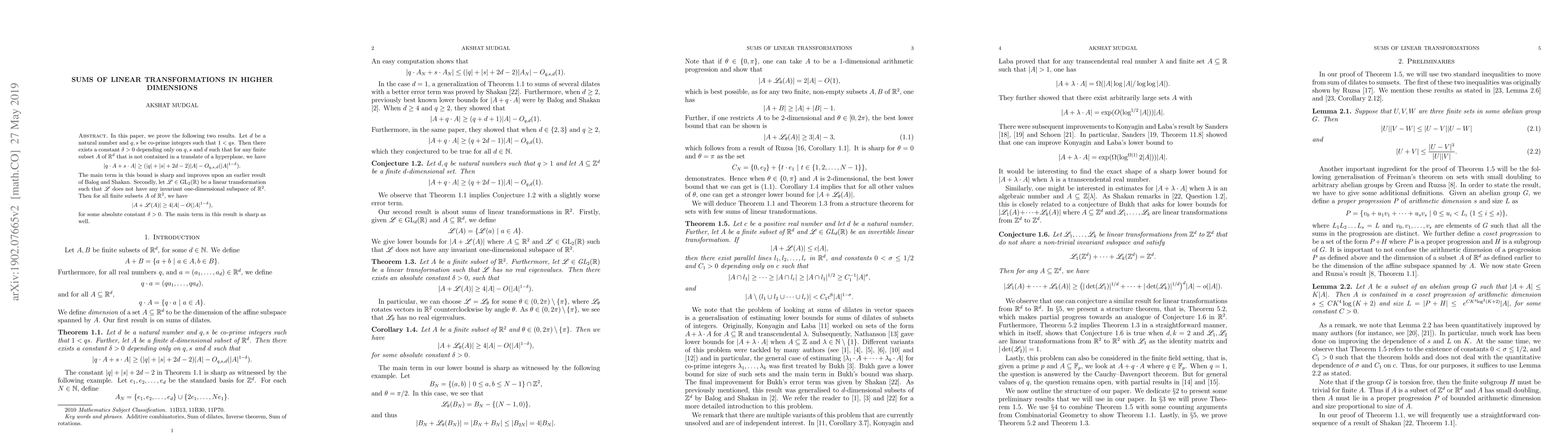 This paper presents two main results on sums of linear transformations in higher dimensions. First, it establishes a bound for sums of the form $qA + sA$ in $mathbb{R}^d$, improving upon previous work. Second, it provides a lower bound for $A + mathscr{L}(A)$ in $mathbb{R}^2$, where $mathscr{L}$ is a specific linear transformation. Both main terms are shown to be sharp.