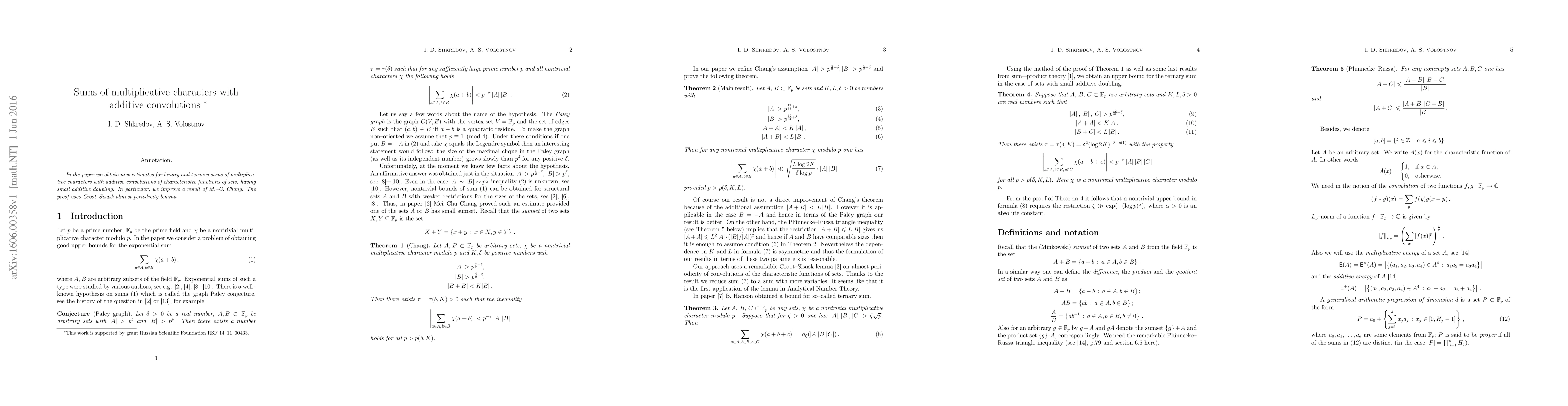 In the paper we obtain new estimates for binary and ternary sums of multiplicative characters with additive convolutions of characteristic functions of sets, having small additive doubling. In particular, we improve a result of M.-C. Chang. The proof uses Croot-Sisask almost periodicity lemma.