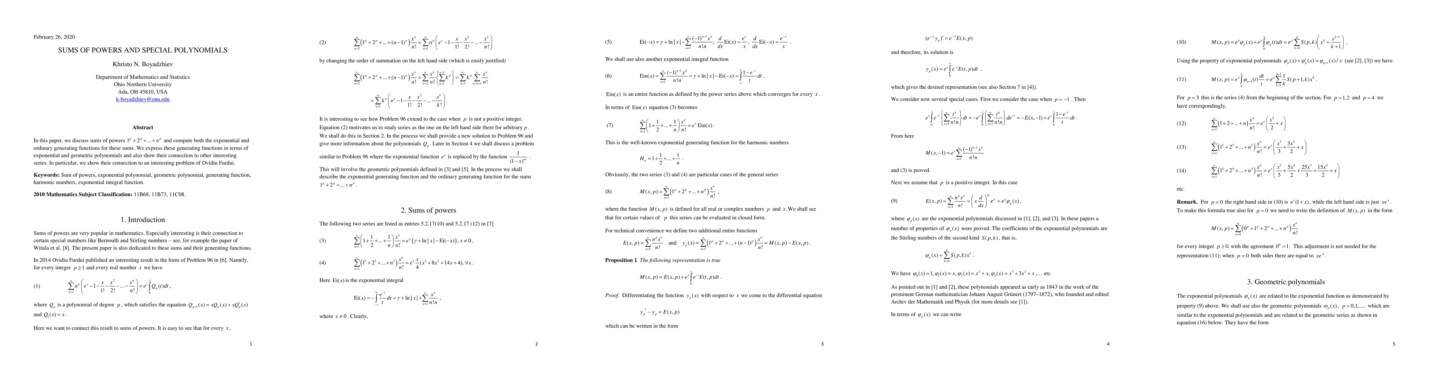 The paper discusses sums of powers of positive integers, computing both exponential and ordinary generating functions for these sums, expressed in terms of exponential and geometric polynomials, and connecting them to other series, including a problem by Ovidiu Furdui.