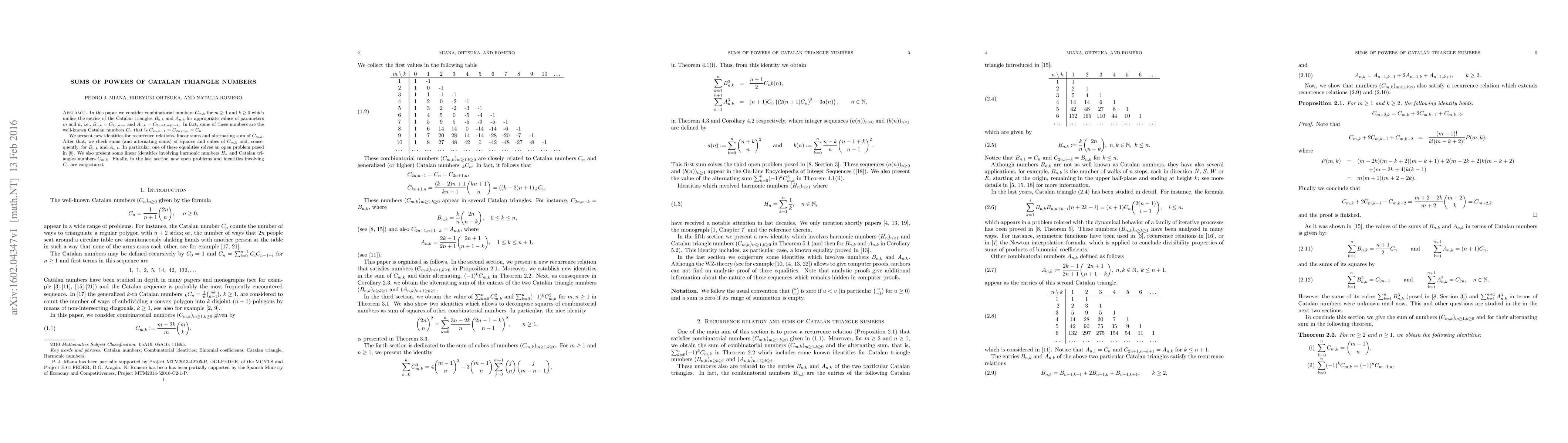 This paper explores combinatorial numbers $C_{m, k}$ that unify Catalan triangles $B_{n, k}$ and $A_{n, k}$, presenting new identities for their recurrence relations, linear sums, and alternating sums. It also investigates sums of squares and cubes of these numbers, solving an open problem and proposing new conjectures and identities involving harmonic numbers and Catalan numbers.