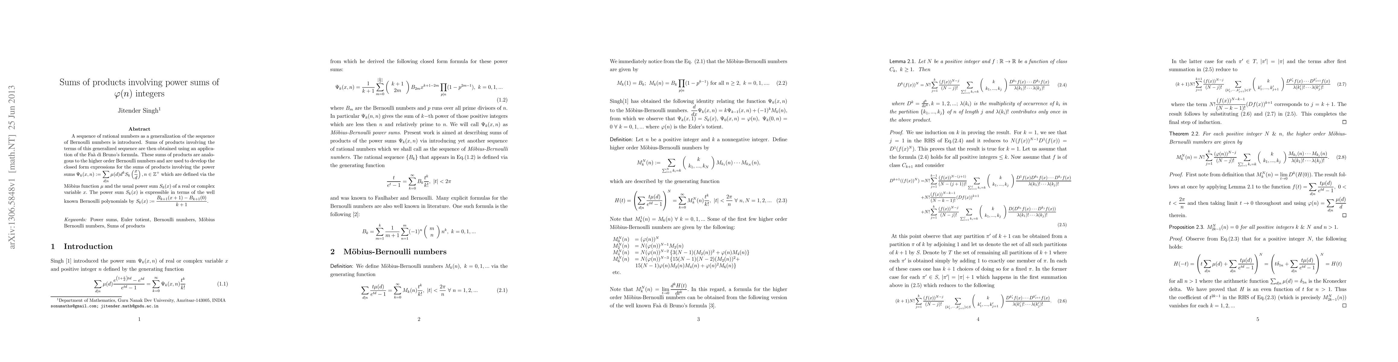 This paper introduces a sequence of rational numbers as a generalization of Bernoulli numbers, deriving sums of products using Faà di Bruno's formula. It then develops closed form expressions for sums involving power sums defined via the Möbius function and Bernoulli polynomials.
