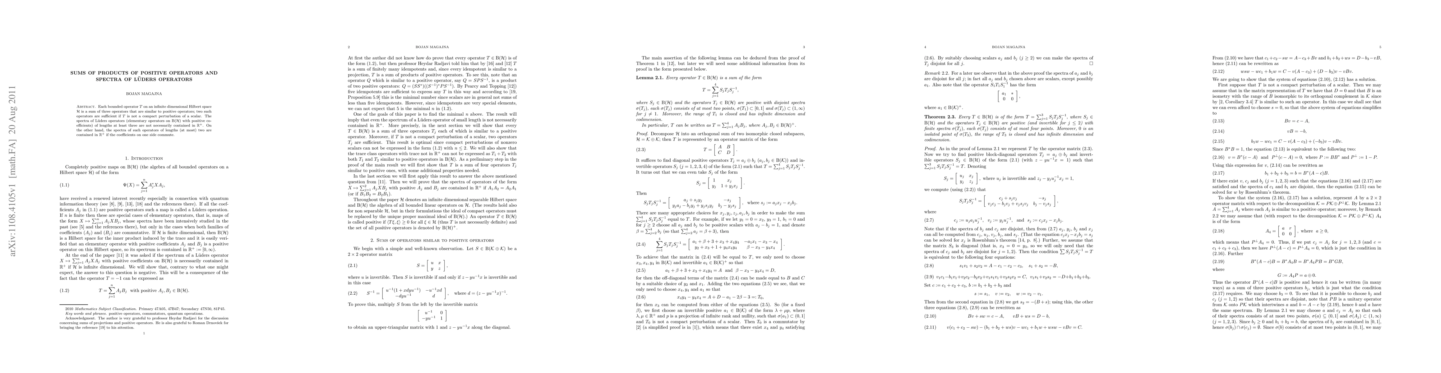 Each bounded operator T on an infinite dimensional Hilbert space H is a sum of three operators that are similar to positive operators; two such operators are sufficient if T is not a compact perturbation of a scalar. The spectra of L\"uders operators (elementary operators on B(H) with positive coefficients) of lengths at least three are not necessarily contained in the set of all nonnegative real numbers. On the other hand, the spectra of such operators of lengths at most two contain only nonnegative real numbers, if the coefficients on one side commute.