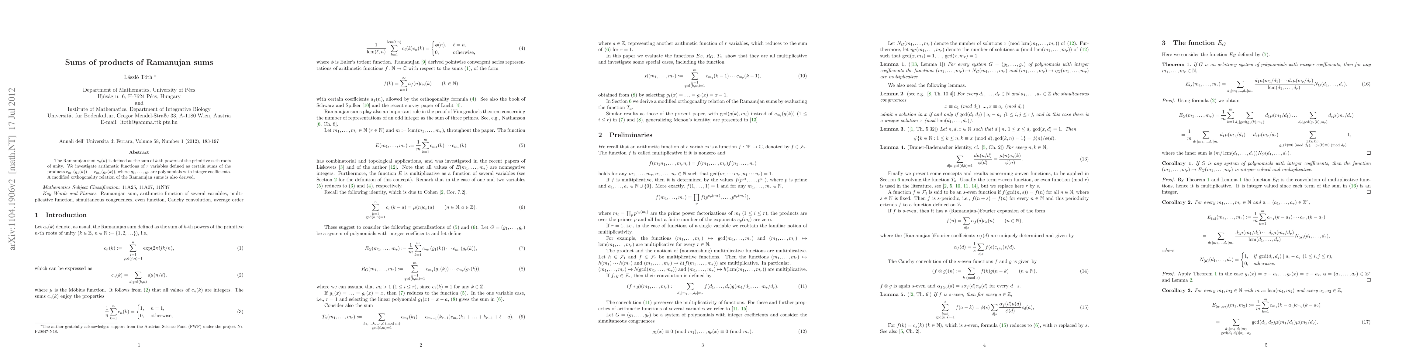 This paper investigates arithmetic functions formed from sums of products of Ramanujan sums, which are defined as powers of primitive roots of unity, and introduces a modified orthogonality relation for these sums.