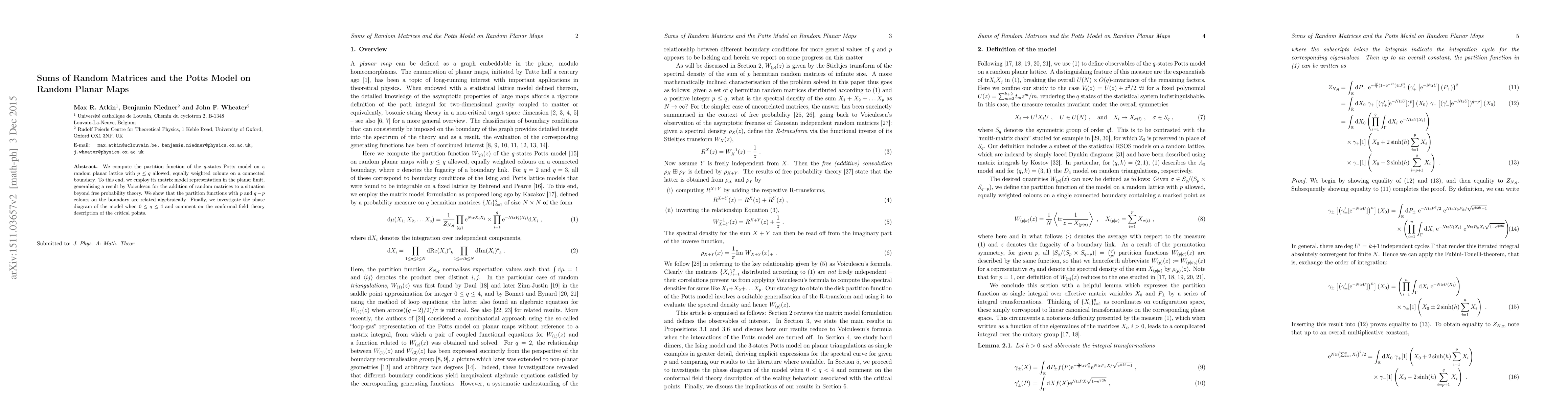 This paper computes the partition function of the $q$-states Potts model on random planar lattices, using a matrix model representation and extending Voiculescu's work on random matrix sums. It reveals an algebraic relationship between partition functions with different boundary colours and explores the phase diagram for $0\leq q\leq 4$, discussing conformal field theory at critical points.