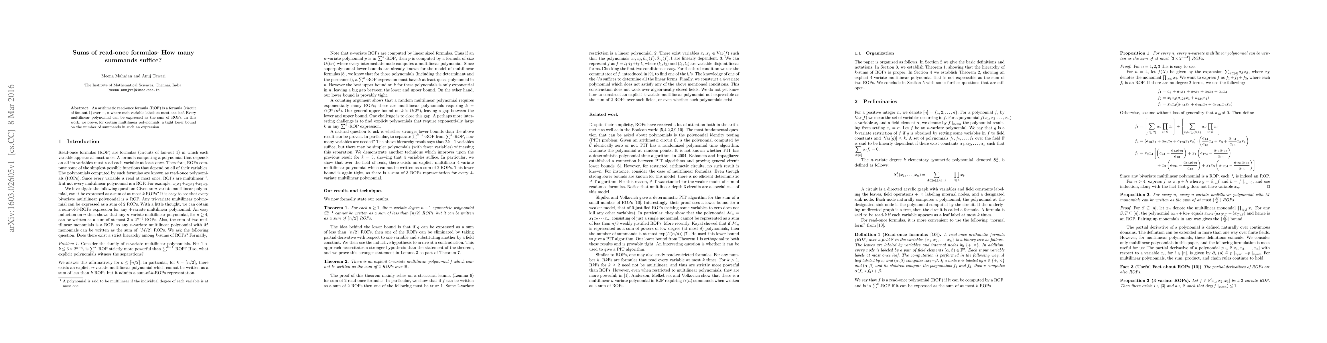 This paper establishes a tight lower bound on the number of summands required to express certain multilinear polynomials as the sum of arithmetic read-once formulas (ROFs), which are circuits where each variable appears at most once.