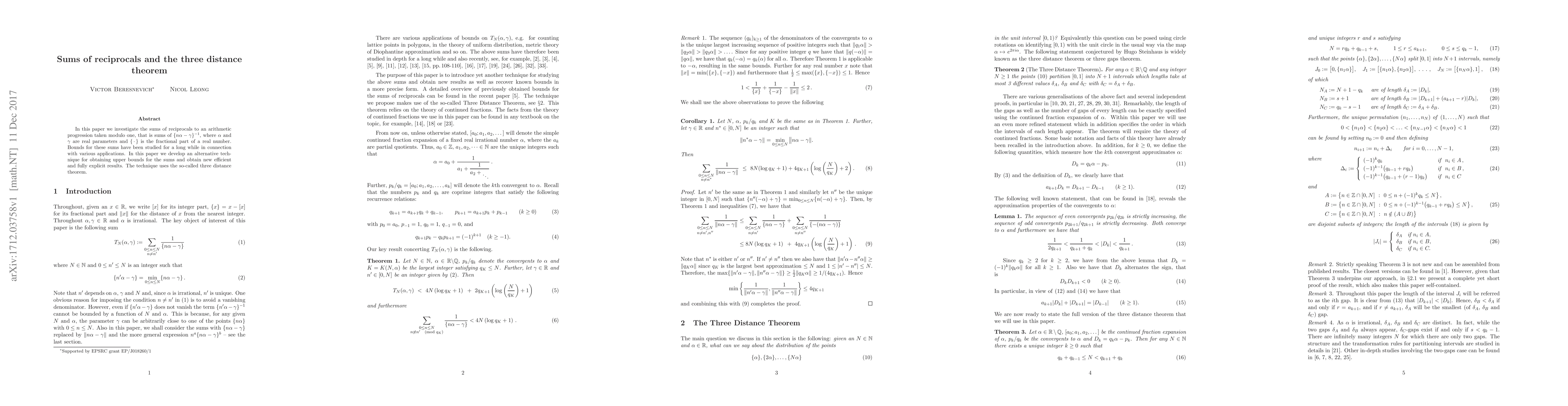 In this paper we investigate the sums of reciprocals to an arithmetic progression taken modulo one, that is sums of $\{n\alpha-\gamma\}^{-1}$, where $\alpha$ and $\gamma$ are real parameters and $\{\,\cdot\,\}$ is the fractional part of a real number. Bounds for these sums have been studied for a long while in connection with various applications. In this paper we develop an alternative technique for obtaining upper bounds for the sums and obtain new efficient and fully explicit results. The technique uses the so-called three distance theorem.