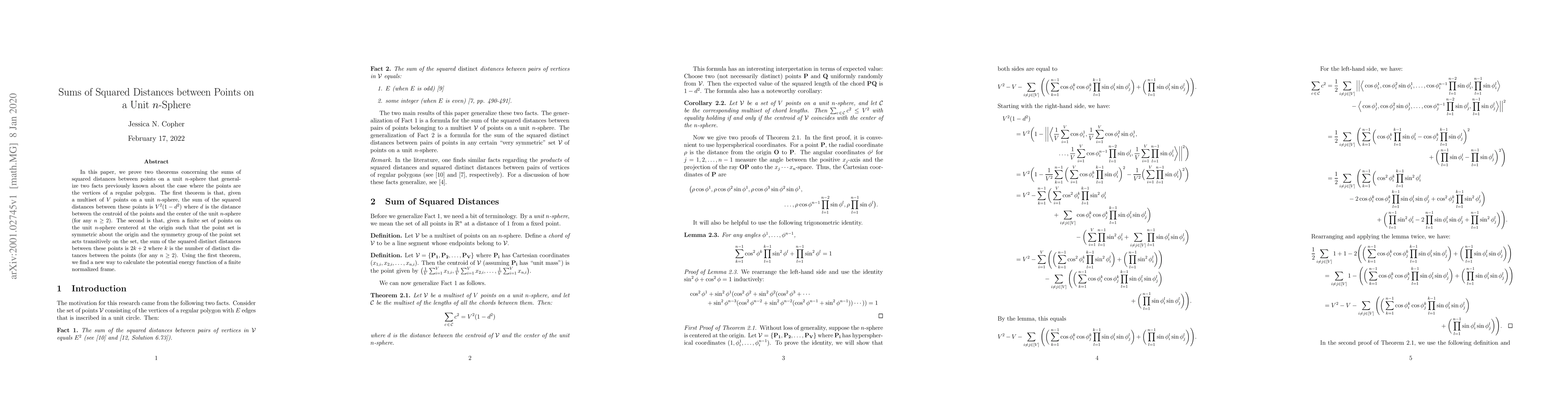 In this paper, we prove two theorems concerning the sums of squared distances between points on a unit $n$-sphere that generalize two facts previously known about the case where the points are the vertices of a regular polygon. The first theorem is that, given a multiset of $V$ points on a unit $n$-sphere, the sum of the squared distances between these points is $V^2 ( 1 - d^2 )$ where $d$ is the distance between the centroid of the points and the center of the unit $n$-sphere (for any $n \geq 2$). The second is that, given a finite set of points on the unit $n$-sphere centered at the origin such that the point set is symmetric about the origin and the symmetry group of the point set acts transitively on the set, the sum of the squared distinct distances between these points is $2k + 2$ where $k$ is the number of distinct distances between the points (for any $n \geq 2$). Using the first theorem, we find a new way to calculate the potential energy function of a finite normalized frame.