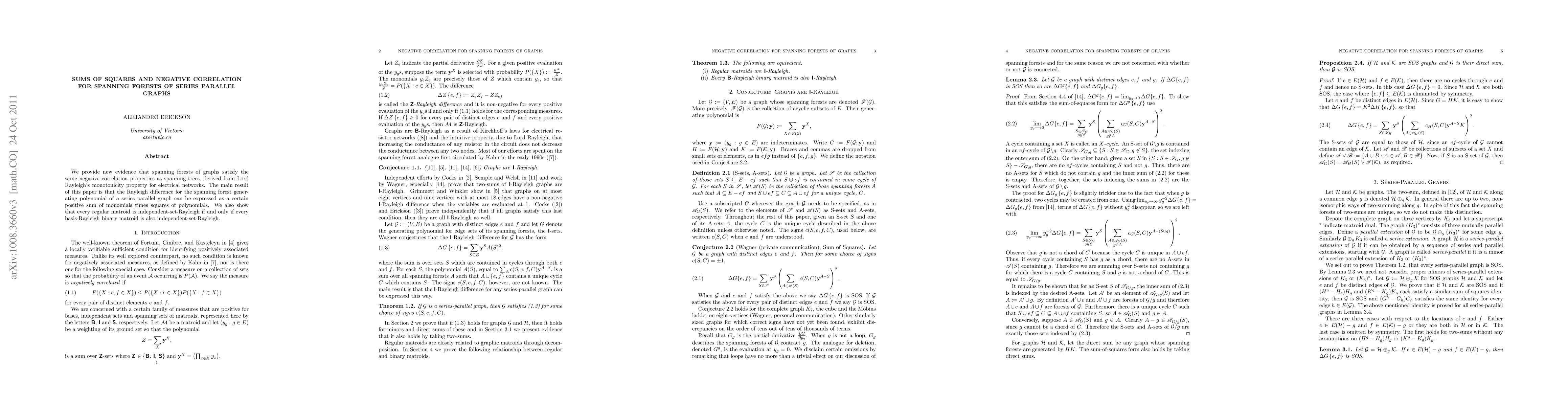 We provide new evidence that spanning forests of graphs satisfy the same negative correlation properties as spanning trees, derived from Lord Rayleigh's monotonicity property for electrical networks. The main result of this paper is that the Rayleigh difference for the spanning forest generating polynomial of a series parallel graph can be expressed as a certain positive sum of monomials times squares of polynomials. We also show that every regular matroid is independent-set-Rayleigh if and only if every basis-Rayleigh binary matroid is also independent-set-Rayleigh.