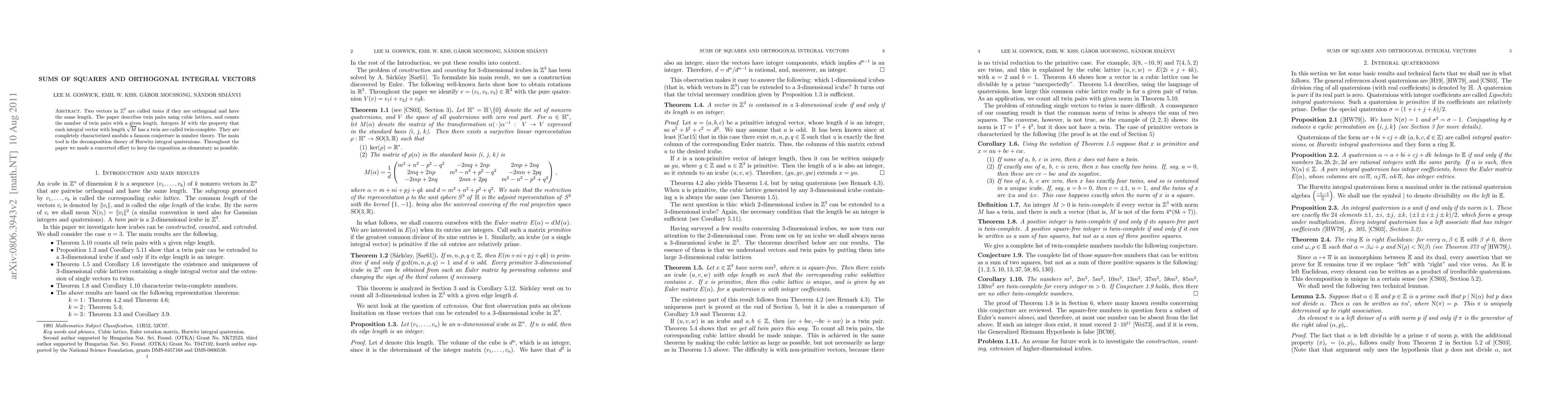 Two vectors in $\BZ^3$ are called \emph{twins} if they are orthogonal and have the same length. The paper describes twin pairs using cubic lattices, and counts the number of twin pairs with a given length. Integers $M$ with the property that each integral vector with length $\sqrt{M}$ has a twin are called twin-complete. They are completely characterized modulo a famous conjecture in number theory. The main tool is the decomposition theory of Hurwitz integral quaternions. Throughout the paper we made a concerted effort to keep the exposition as elementary as possible.