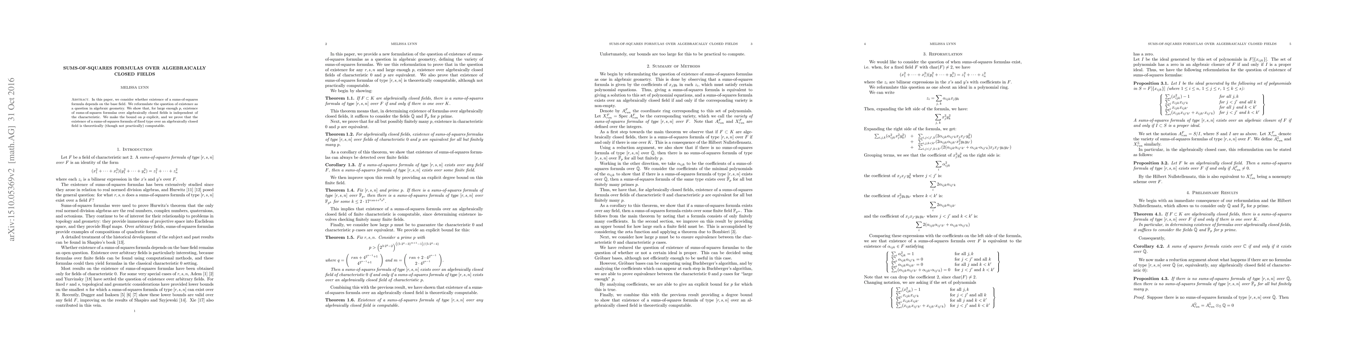 In this paper, we consider whether existence of a sums-of-squares formula depends on the base field. We reformulate the question of existence as a question in algebraic geometry. We show that, for large enough p, existence of sums-of-squares formulas over algebraically closed fields is independent of the characteristic. We make the bound on p explicit, and we prove that the existence of a sums-of-squares formula of fixed type over an algebraically closed field is theoretically (though not practically) computable.