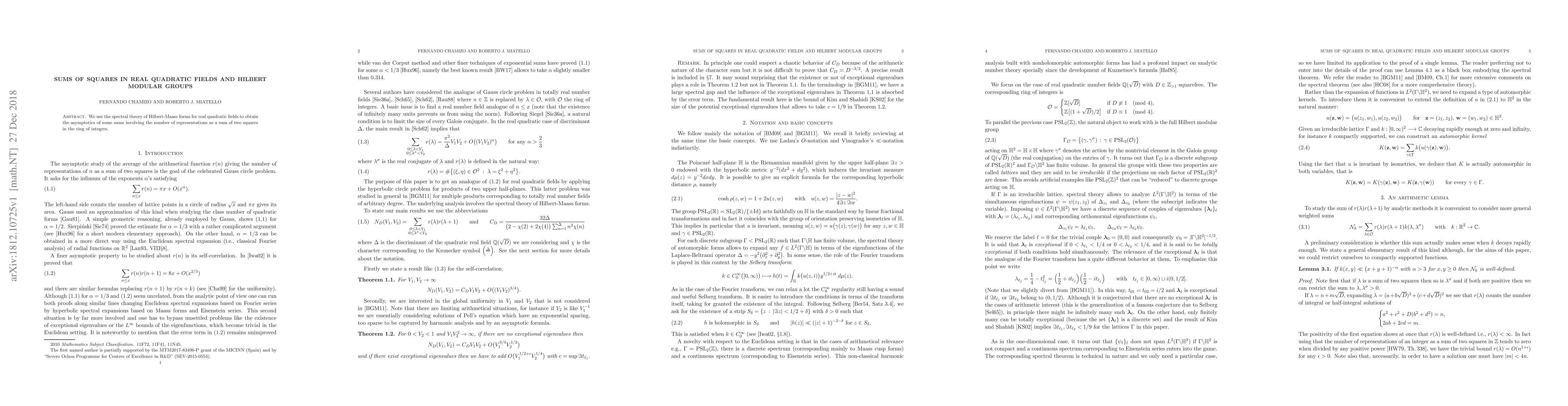 This paper employs spectral theory of Hilbert-Maass forms for real quadratic fields to derive asymptotic results for sums related to the number of representations of integers as sums of two squares in their respective integer rings.