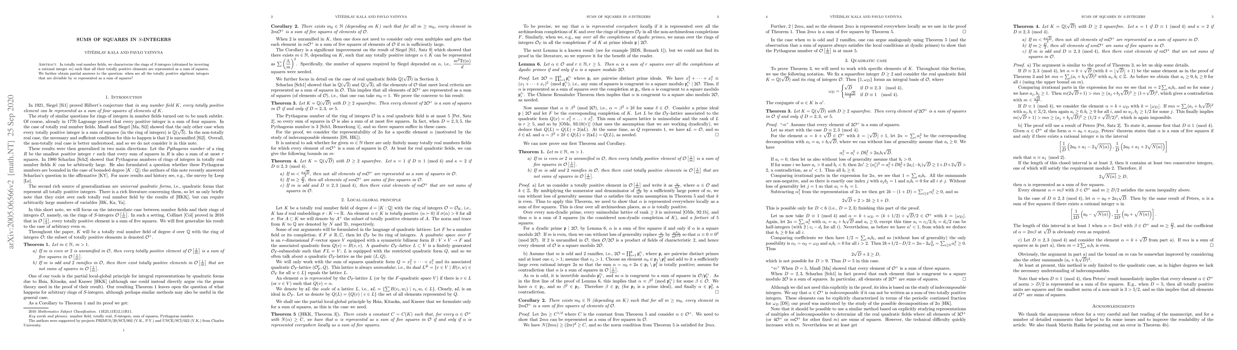 This paper characterizes the rings of $S$-integers in totally real number fields where all their positive elements can be represented as a sum of squares, providing insights into algebraic integers divisible by a rational integer.