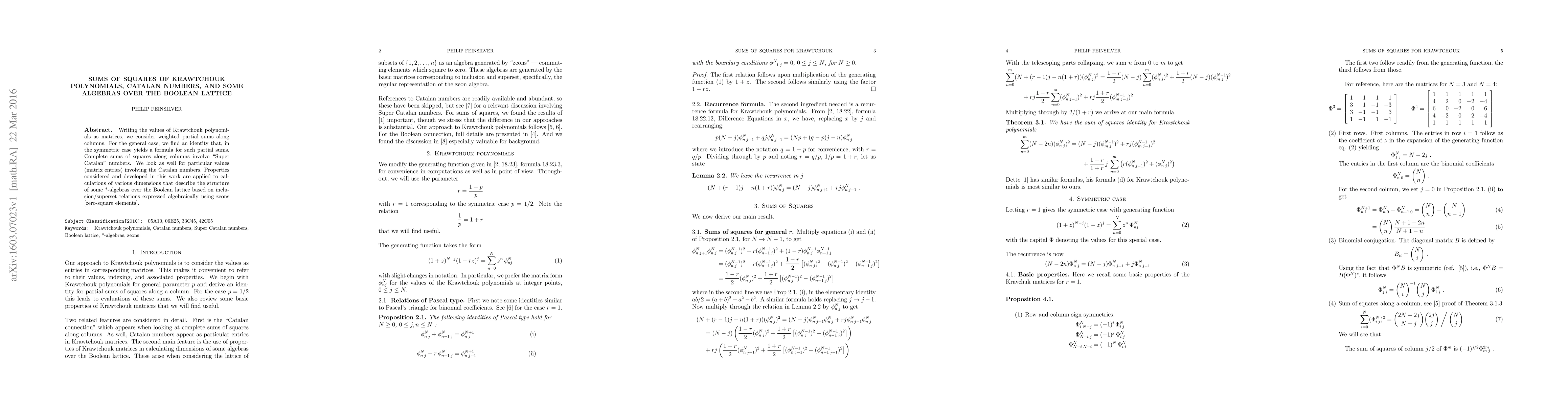 This paper explores the sums of squares of Krawtchouk polynomials, revealing a connection to "Super Catalan" numbers and Catalan numbers. It derives an identity for weighted partial sums of these polynomials and applies the findings to describe the structure of *-algebras over the Boolean lattice using zeons.