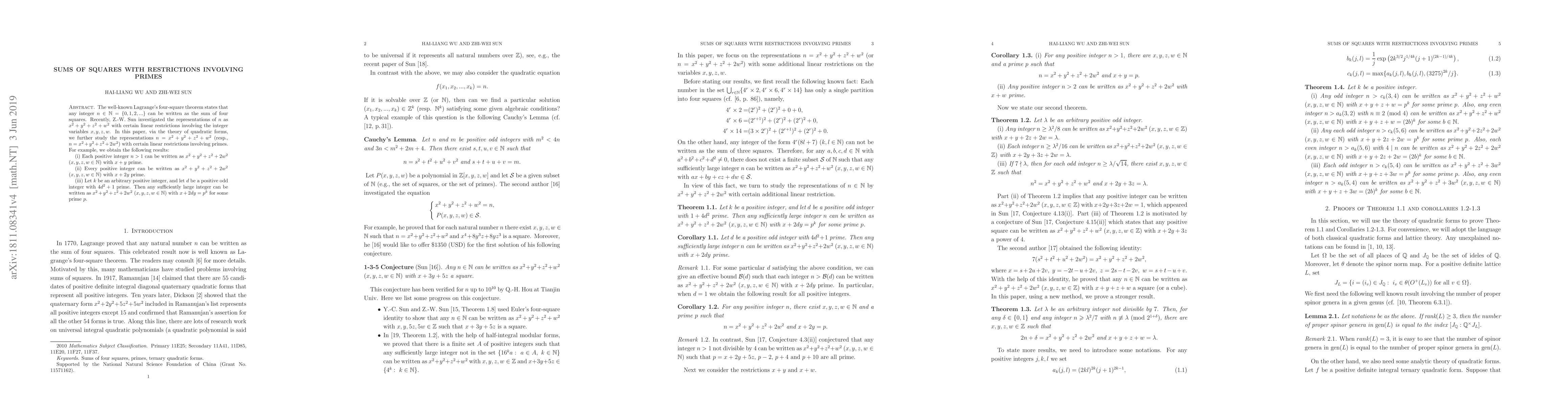 This paper explores representations of integers as sums of squares under linear restrictions involving primes. It extends previous work on four-square representations by proving specific results, such as every positive integer can be expressed as $x^2+y^2+z^2+2w^2$ with $x+y$ or $x+2y$ prime, and sufficiently large integers can be represented with $x+2dy=p^k$ for some prime $p$, given certain conditions on $d$.