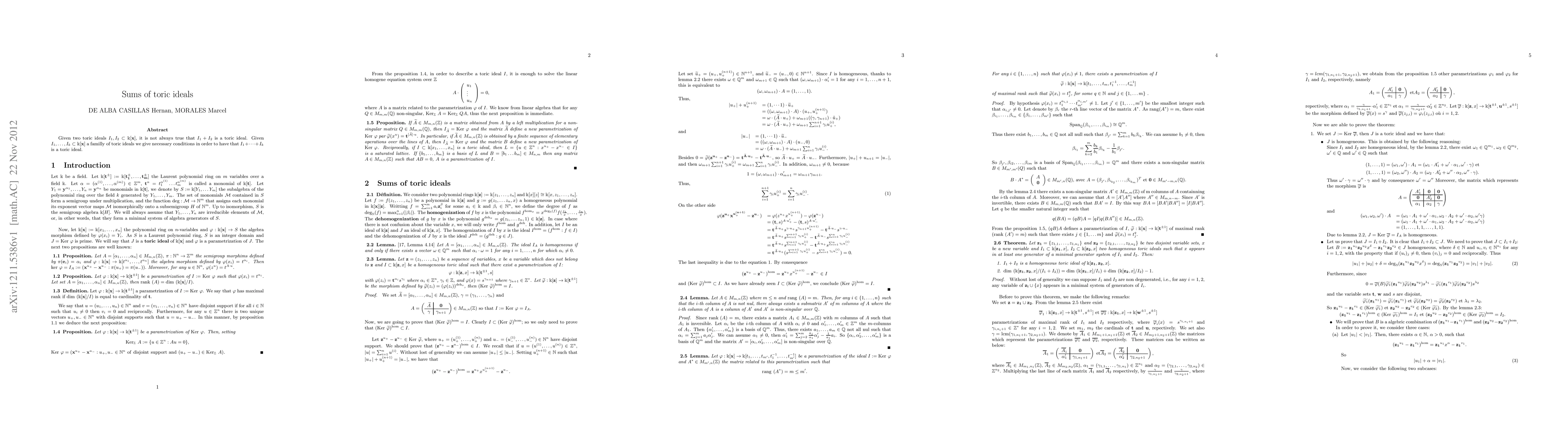 Given two toric ideals $I_1,I_2\subset\si$, it is not always true that $I_1+I_2$ is a toric ideal. Given $I_1,...,I_k\subset\si$ a familly of toric ideals we give necessary conditions in order to have that $I_1+...+I_k$ is a toric ideal.