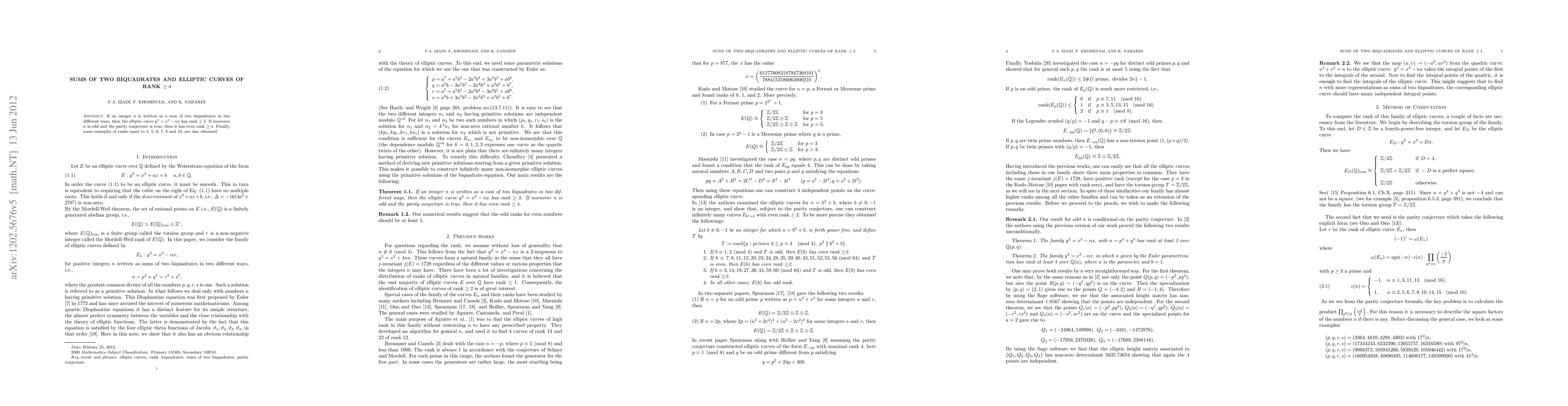 This paper explores the relationship between integers expressible as sums of two biquadrates in different ways and the rank of associated elliptic curves. It demonstrates that such integers lead to elliptic curves of rank at least 3, and under the parity conjecture, even rank at least 4, with examples of ranks up to 10 provided.