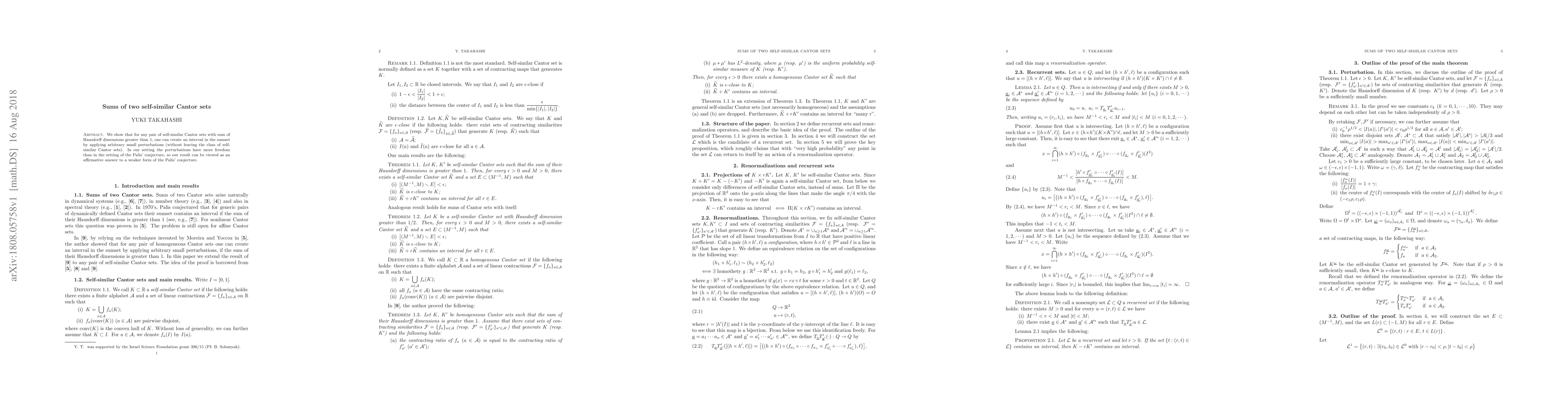 This paper demonstrates that for any pair of self-similar Cantor sets whose combined Hausdorff dimensions exceed 1, it is possible to generate an interval within their sumset through minor perturbations, maintaining the self-similarity. This result supports a weaker version of the Palis conjecture.