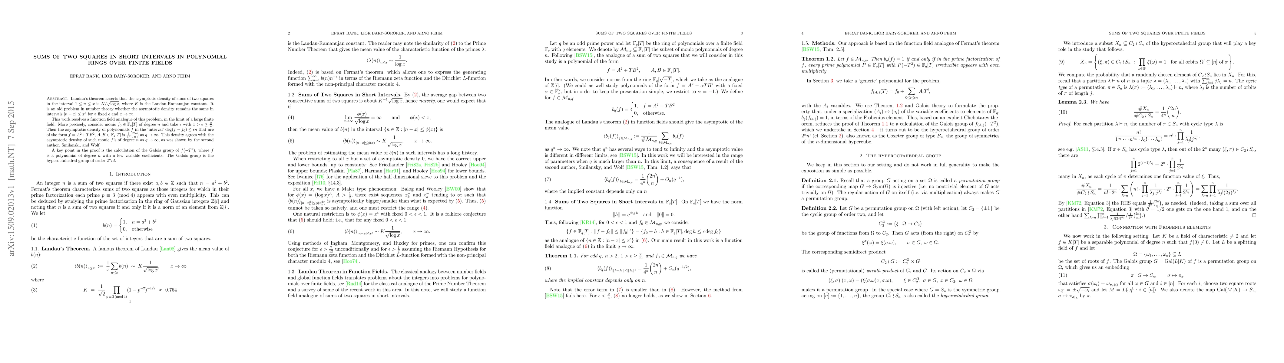 Landau's theorem asserts that the asymptotic density of sums of two squares in the interval $1\leq n\leq x$ is $K/{\sqrt{\log x}}$, where $K$ is the Landau-Ramanujan constant. It is an old problem in number theory whether the asymptotic density remains the same in intervals $|n-x|\leq x^{\epsilon}$ for a fixed $\epsilon$ and $x\to \infty$. This work resolves a function field analogue of this problem, in the limit of a large finite field. More precisely, consider monic $f_0\in \mathbb{F}_q[T]$ of degree $n$ and take $\epsilon$ with $1>\epsilon\geq \frac2n$. Then the asymptotic density of polynomials $f$ in the `interval' ${\rm deg}(f-f_0)\leq \epsilon n$ that are of the form $f=A^2+TB^2$, $A,B\in \mathbb{F}_q[T]$ is $\frac{1}{4^n}\binom{2n}{n}$ as $q\to \infty$. This density agrees with the asymptotic density of such monic $f$'s of degree $n$ as $q\to \infty$, as was shown by the second author, Smilanski, and Wolf. A key point in the proof is the calculation of the Galois group of $f(-T^2)$, where $f$ is a polynomial of degree $n$ with a few variable coefficients: The Galois group is the hyperoctahedral group of order $2^nn!$.
