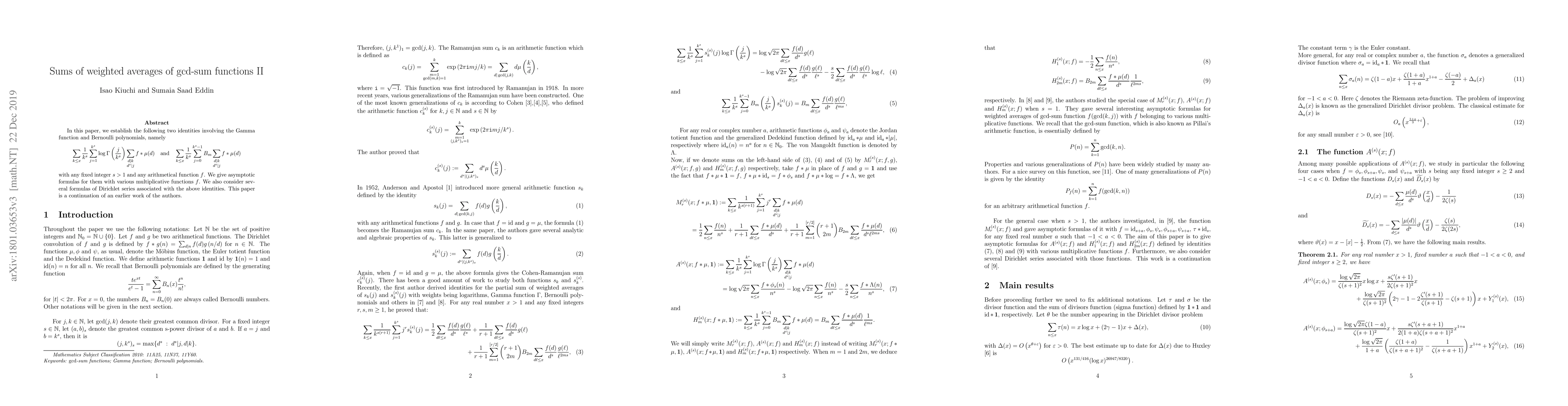 In this paper, we establish the following two identities involving the Gamma function and Bernoulli polynomials, namely $$ \sum_{k\leq x}\frac{1}{k^s} \sum_{j=1}^{k^s}\log\Gamma\left(\frac{j}{k^s}\right) \sum_{\substack{d|k \\ d^{s}|j}}f*\mu(d) \quad {\rm and } \quad \sum_{k\leq x}\frac{1}{k^s}\sum_{j=0}^{k^{s}-1} B_{m}\sum_{\substack{d|k \\ d^{s}|j}} f*\mu(d) $$ with any fixed integer $s> 1$ and any arithmetical function $f$. We give asymptotic formulas for them with various multiplicative functions $f$. We also consider several formulas of the Dirichlet series associated with the above identities. This paper is a continuation of an earlier work of the authors.