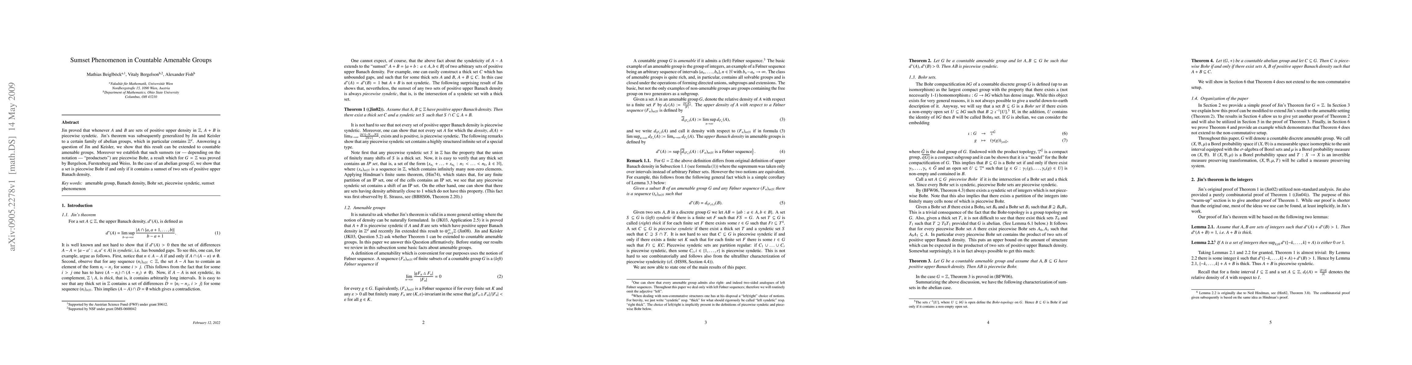 Jin proved that whenever $A$ and $B$ are sets of positive upper density in $\Z$, $A+B$ is piecewise syndetic. Jin's theorem was subsequently generalized by Jin and Keisler to a certain family of abelian groups, which in particular contains $\Z^d$. Answering a question of Jin and Keisler, we show that this result can be extended to countable amenable groups. Moreover we establish that such sumsets (or -- depending on the notation -- "productsets") are piecewise Bohr, a result which for $G=\Z$ was proved by Bergelson, Furstenberg and Weiss. In the case of an abelian group $G$, we show that a set is piecewise Bohr if and only if it contains a sumset of two sets of positive upper Banach density.