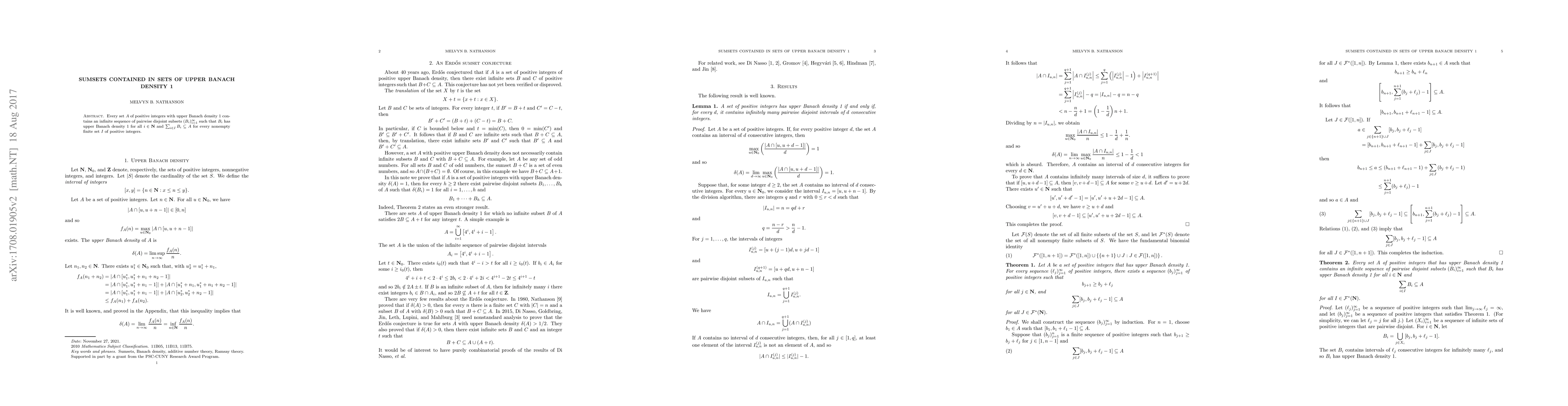 Every set $A$ of positive integers with upper Banach density 1 contains an infinite sequence of pairwise disjoint subsets $(B_i)_{i=1}^{\infty}$ such that $B_i$ has upper Banach density 1 for all $i \in \mathbf{N}$ and $\sum_{i\in I} B_i \subseteq A$ for every nonempty finite set $I$ of positive integers.