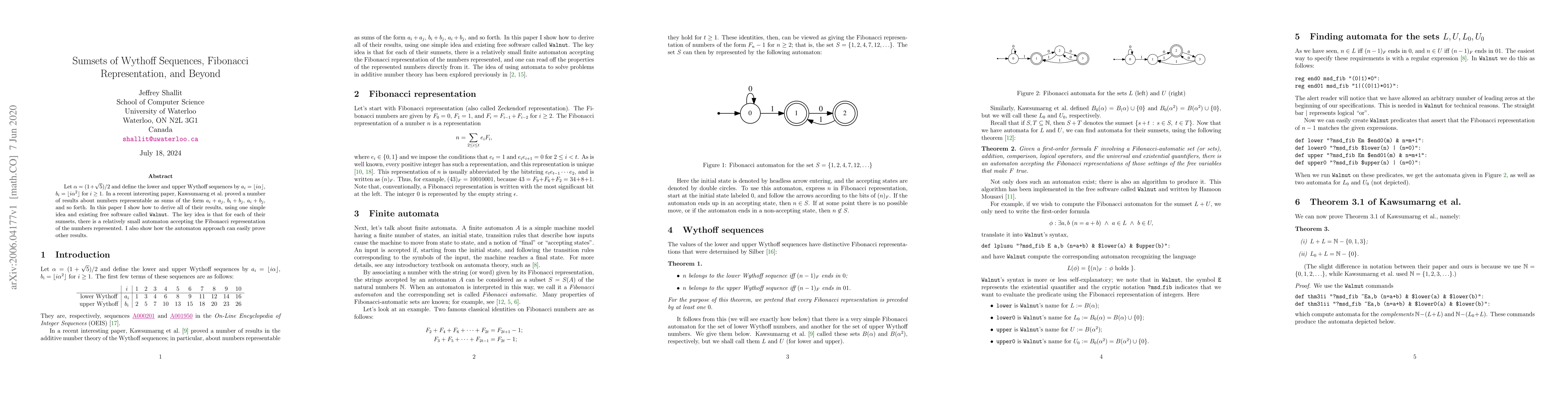 Let $\alpha = (1+\sqrt{5})/2$ and define the lower and upper Wythoff sequences by $a_i = \lfloor i \alpha \rfloor$, $b_i = \lfloor i \alpha^2 \rfloor$ for $i \geq 1$. In a recent interesting paper, Kawsumarng et al. proved a number of results about numbers representable as sums of the form $a_i + a_j$, $b_i + b_j$, $a_i + b_j$, and so forth. In this paper I show how to derive all of their results, using one simple idea and existing free software called Walnut. The key idea is that for each of their sumsets, there is a relatively small automaton accepting the Fibonacci representation of the numbers represented. I also show how the automaton approach can easily prove other results.