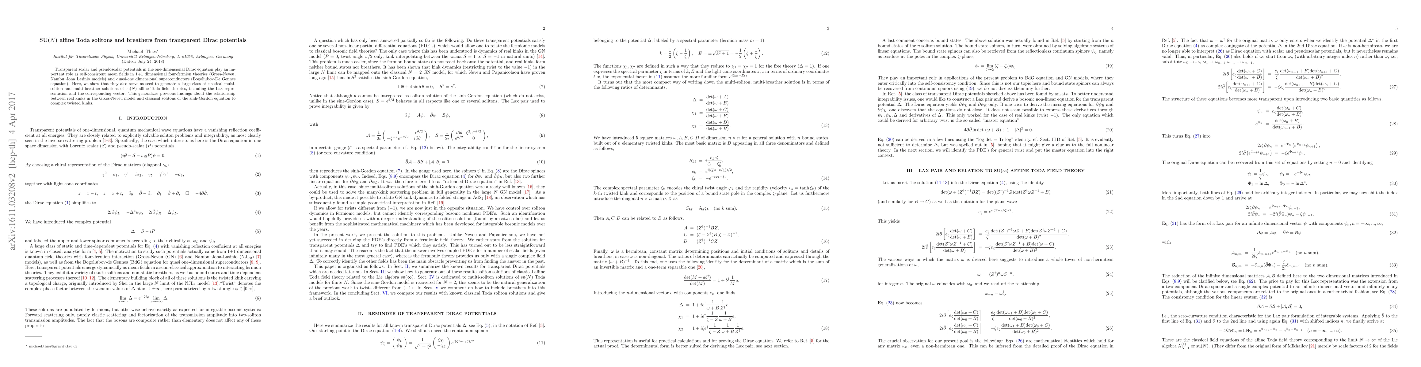 Transparent scalar and pseudoscalar potentials in the one-dimensional Dirac equation play an important role as self-consistent mean fields in 1+1 dimensional four-fermion theories (Gross-Neveu, Nambu-Jona Lasinio models) and quasi-one dimensional superconductors (Bogoliubov-De Gennes equation). Here, we show that they also serve as seed to generate a large class of classical multi-soliton and multi-breather solutions of su(N) affine Toda field theories, including the Lax representation and the corresponding vector. This generalizes previous findings about the relationship between real kinks in the Gross-Neveu model and classical solitons of the sinh-Gordon equation to complex twisted kinks.