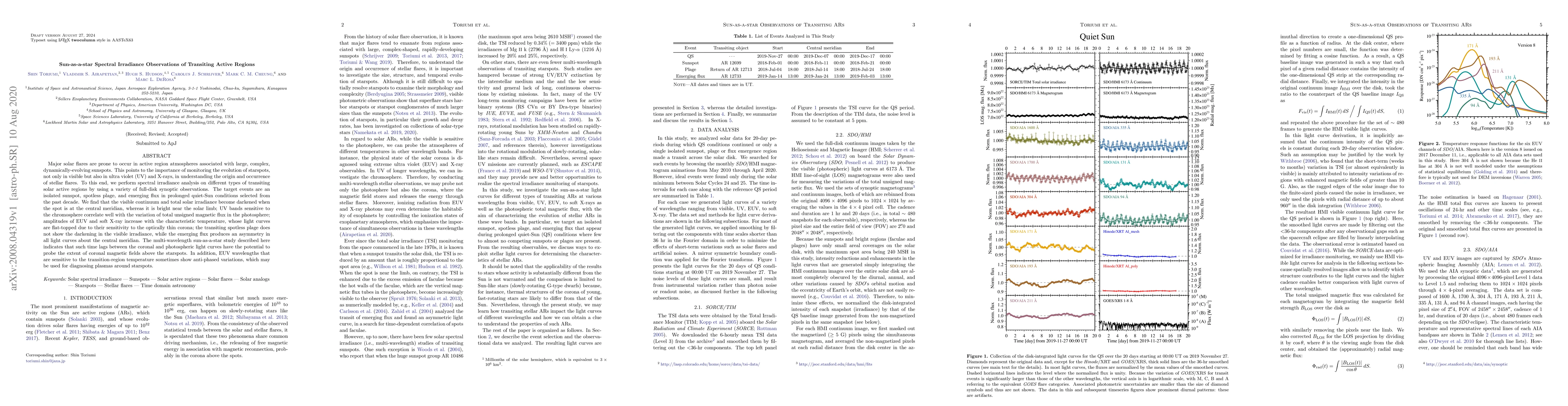 This study analyzes spectral irradiance from transiting solar active regions, including sunspots, spotless plages, and emerging flux, to understand stellar flare origins. Findings show that UV bands correlate with magnetic flux variations, while EUV and X-ray emissions indicate coronal magnetic field extents, suggesting time lags between coronal and photospheric light curves can probe these magnetic fields.