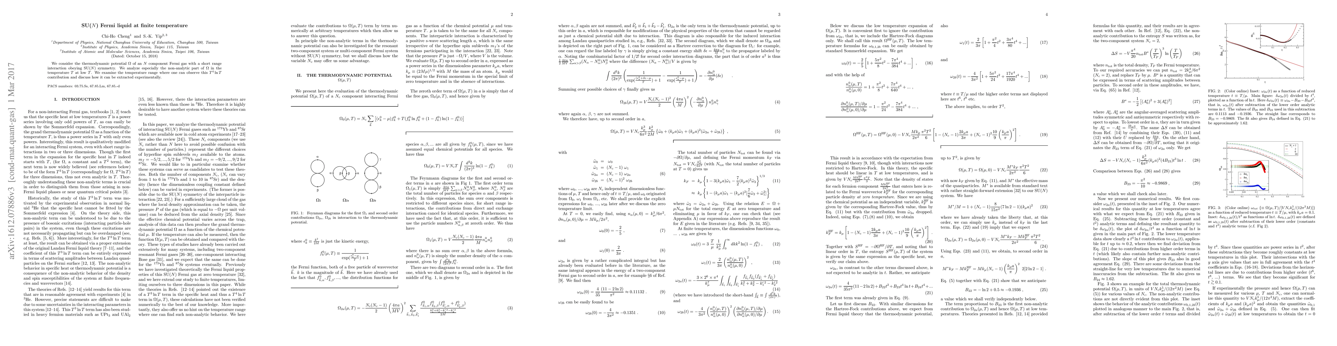 We consider the thermodynamic potential $\Omega$ of an N component Fermi gas with a short range interaction obeying SU(N) symmetry. We analyze especially the part of $\Omega$ that depends on the temperature T non-analytically for small T . We examine the temperature range where one can observe this $T^4 ln T$ contribution and discuss how it can be extracted experimentally.